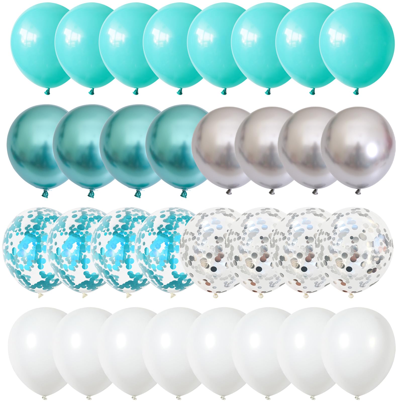 🎉 Teal Silver White Balloons - You will get 35 pieces 12 inch latex party balloons set, includes teal / turquoise 10pcs, metallic green 5pcs, metallic silver 5pcs, light blue confetti 5pcs, silver confetti 5pcs, matte white 5pcs, come with 1pc balloon ribbon. Perfect for boys birthday baby shower christening aqua party decorations supplies.