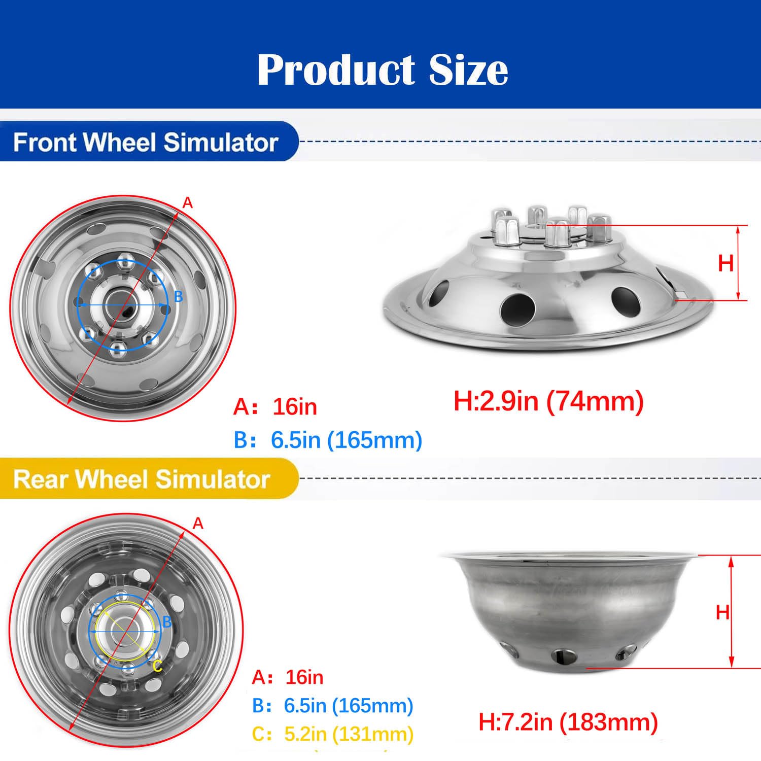 VEHICLE FITMENT: Wheel Simulators Compatible with Ford F350 1974-1998;E350/E450 1992-2021;Dodge Ram 3500 1974-1999, Fits16inch Wheels With 8-Lug 8-Hand Hole trucks, vans, and RV's per years noted above.