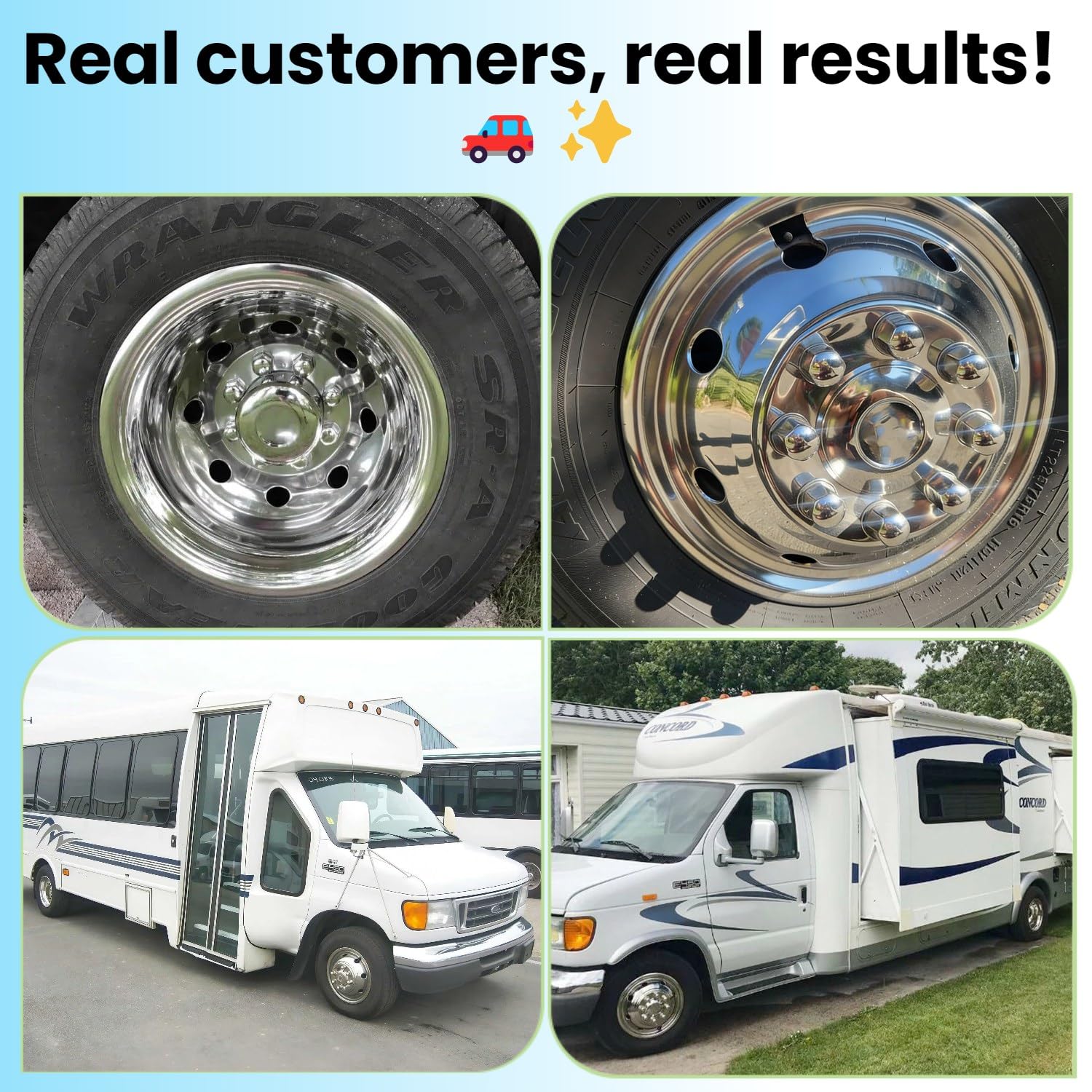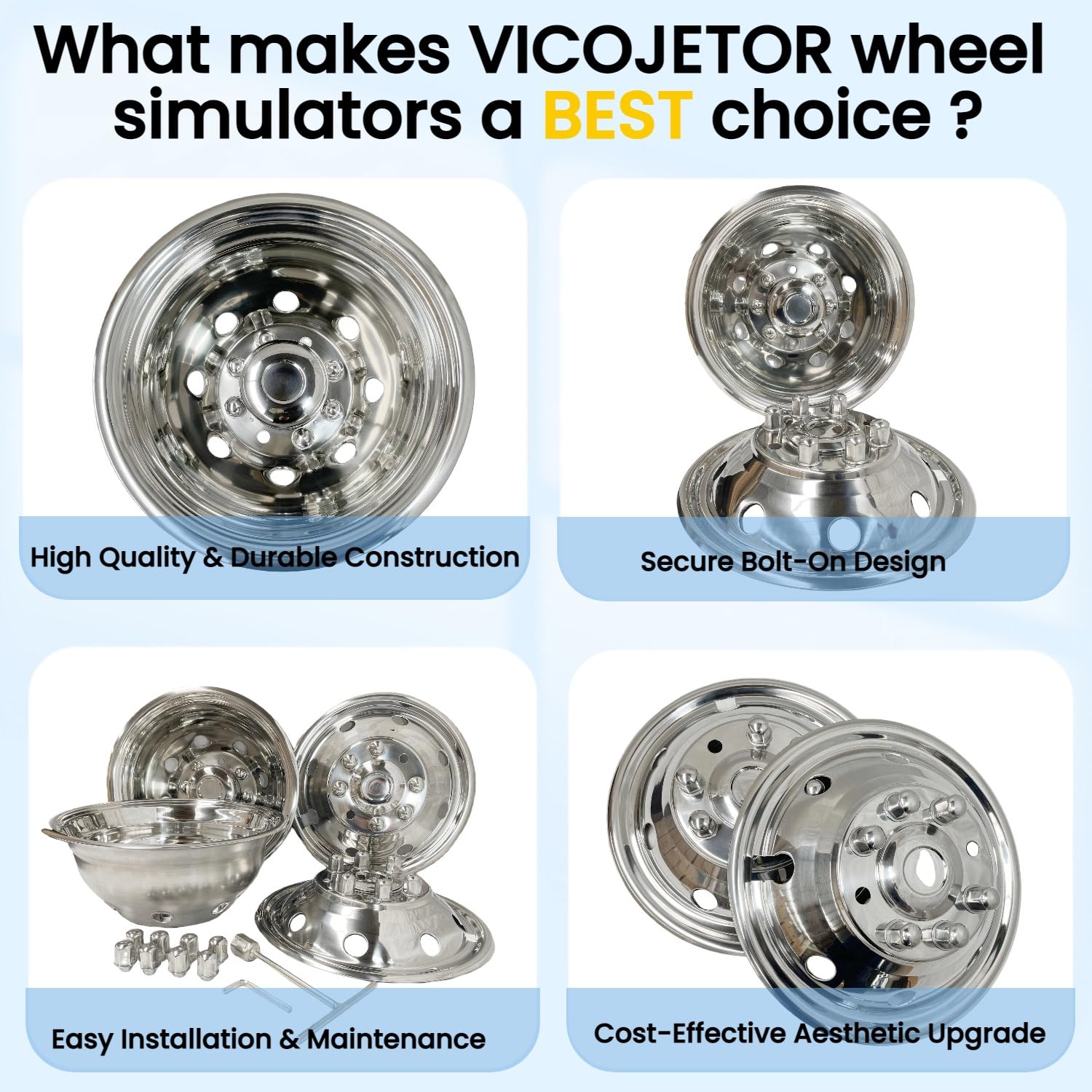 PERFECT LOOK: Wheel Covers made from 304L Wonderful shine Stainless steel which owes an elegant mirror polished finish, Offers an exciting and economical way to make you vehicle look great.