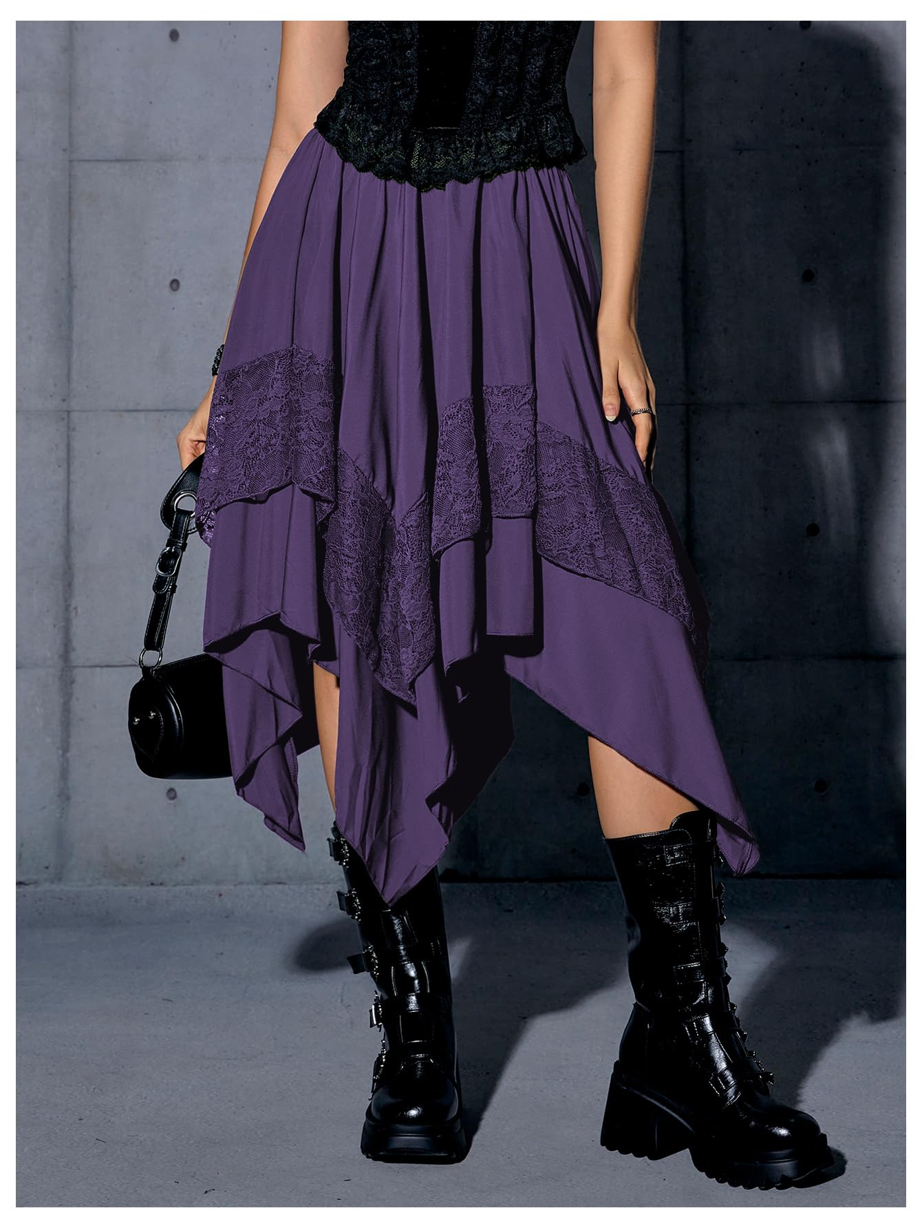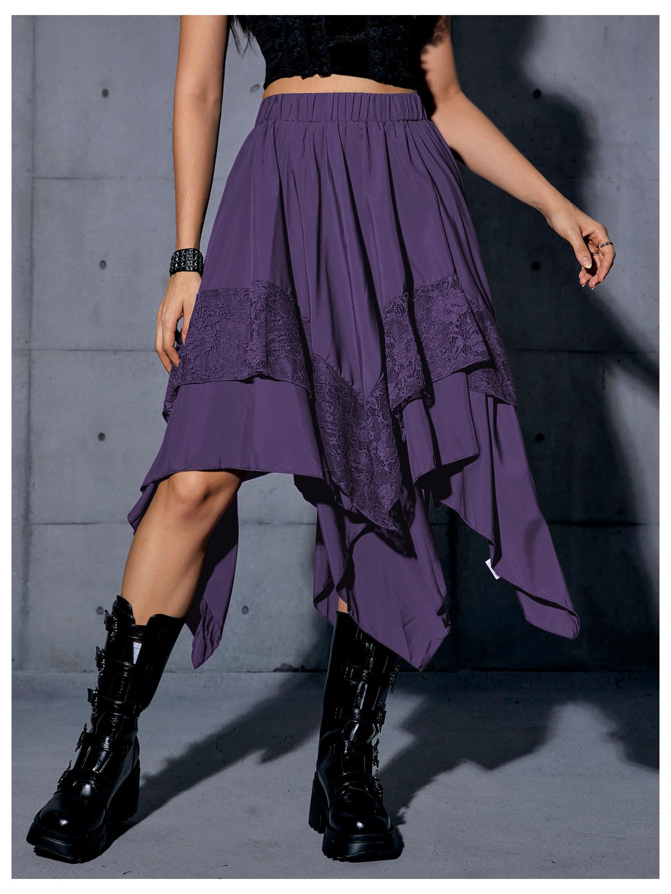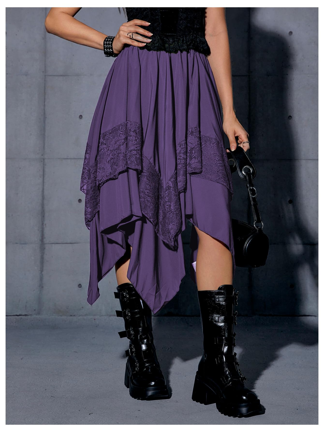 Elastic Waist, Lace Trim, Asymmetrical High Low Hem, A Line, Flowy, Gothic Steampunk Skirt, Casual Midi Skirt