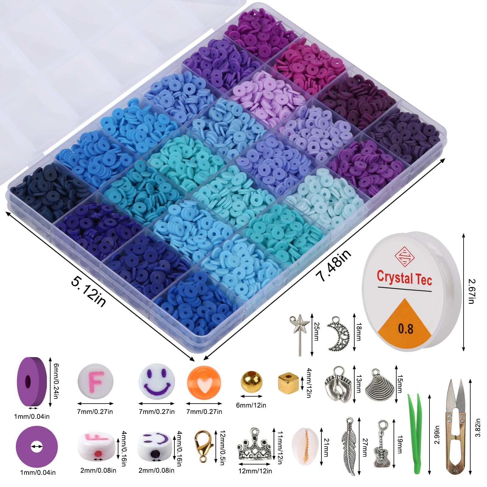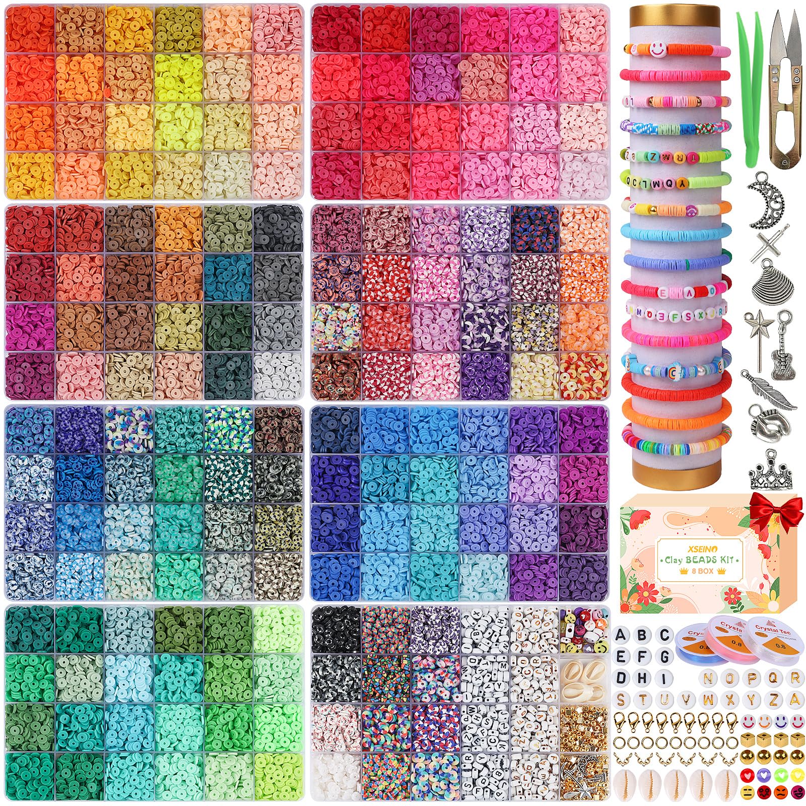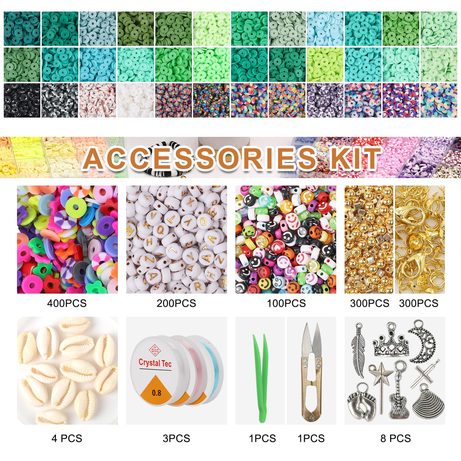 【Clay Beads Kit】:8 boxes of clay beads in 180 colors, 200 pieces per color. It also includes letter beads in 2 styles gold and black,200 pieces per style,80 Smile beads and colorful love beads,150 gold star beads and gold square beads,4 shell pendants,8 sterling silver pendants,3 roll of colorful crystal cord, 1 pair of scissors and 1 pair of tweezers,30 gold jump rings and 6 gold lobster clasps.