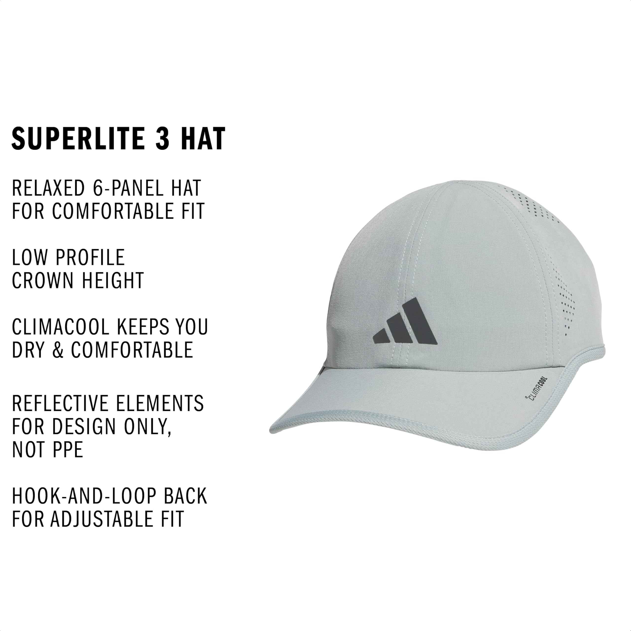 Description Designed with the active man in mind, this adidas Superlite hat for men offers both style and functionality. Crafted from recycled materials, these adidas men's caps are part of a conscious effort to maintain environmental responsibility while providing top-notch headwear. The lightweight 6-panel construction includes a premium 3D adidas logo, making it a standout addition to any wardrobe. Featuring mesh panels for airflow and moisture-wicking capabilities, this hat helps you stay cool and dry, whether you're training or relaxing. The non-glare lining under the visor enhances vision on sunlit days, and with UPF 50 sun protection, these caps shield against the sun’s most harmful rays. The adjustable hook-and-loop back closure offers a customizable fit, making sure the one-size design meets your comfort needs. Although the reflective elements add a sleek design touch, please note they are not intended for personal protective equipment use.