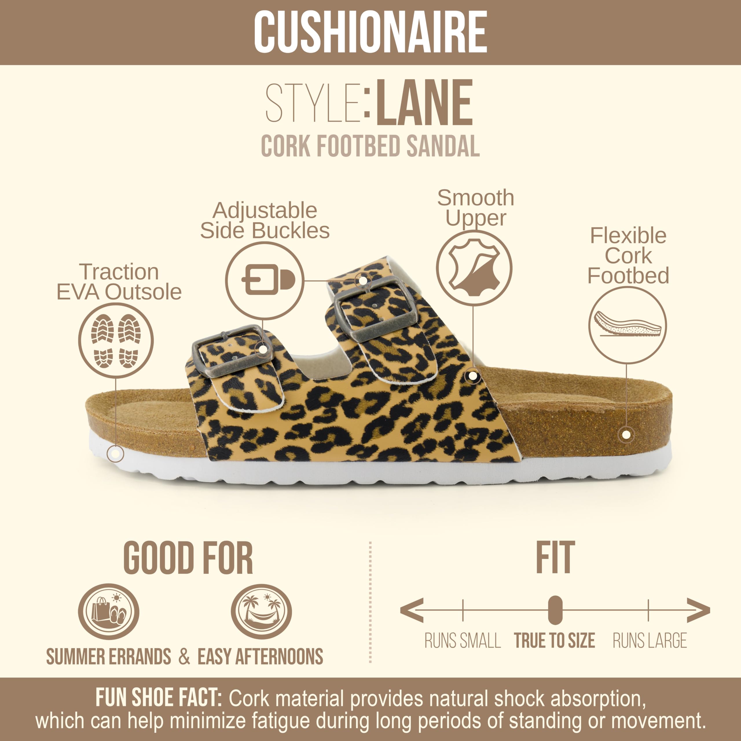 Description Women's Cushionaire comfort Cork footbed sandal. Stay cool with these high quality sandals that will give you comfort throughout your day.