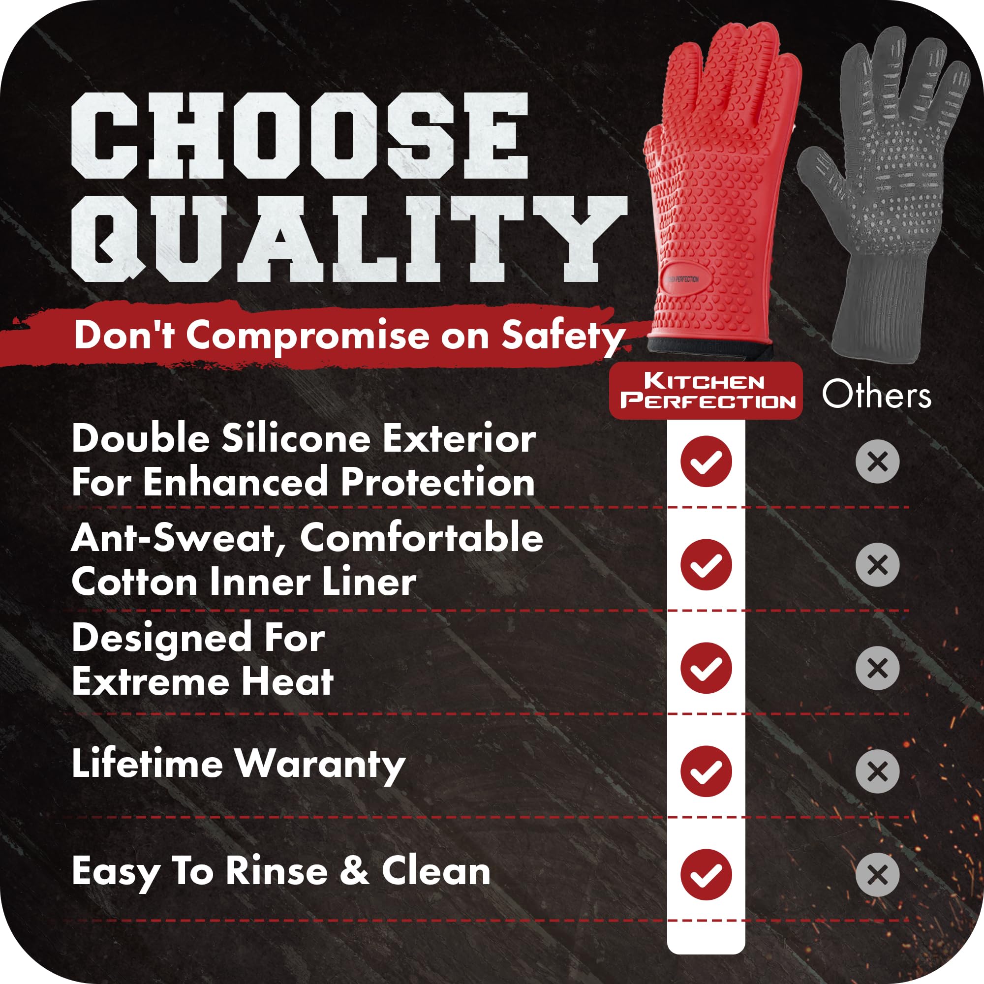 Lifetime Warranty By Kitchen Perfection - If you feel that you didn’t get the best product you are more than welcome to contact us, we are here for you for any problem, sizing issues, and more. These are the best barbecue gloves for heat-resistant cooking for men's and women's protective mitts. That's why everyone likes them so much! You better get a few to give to your friends as a gift.