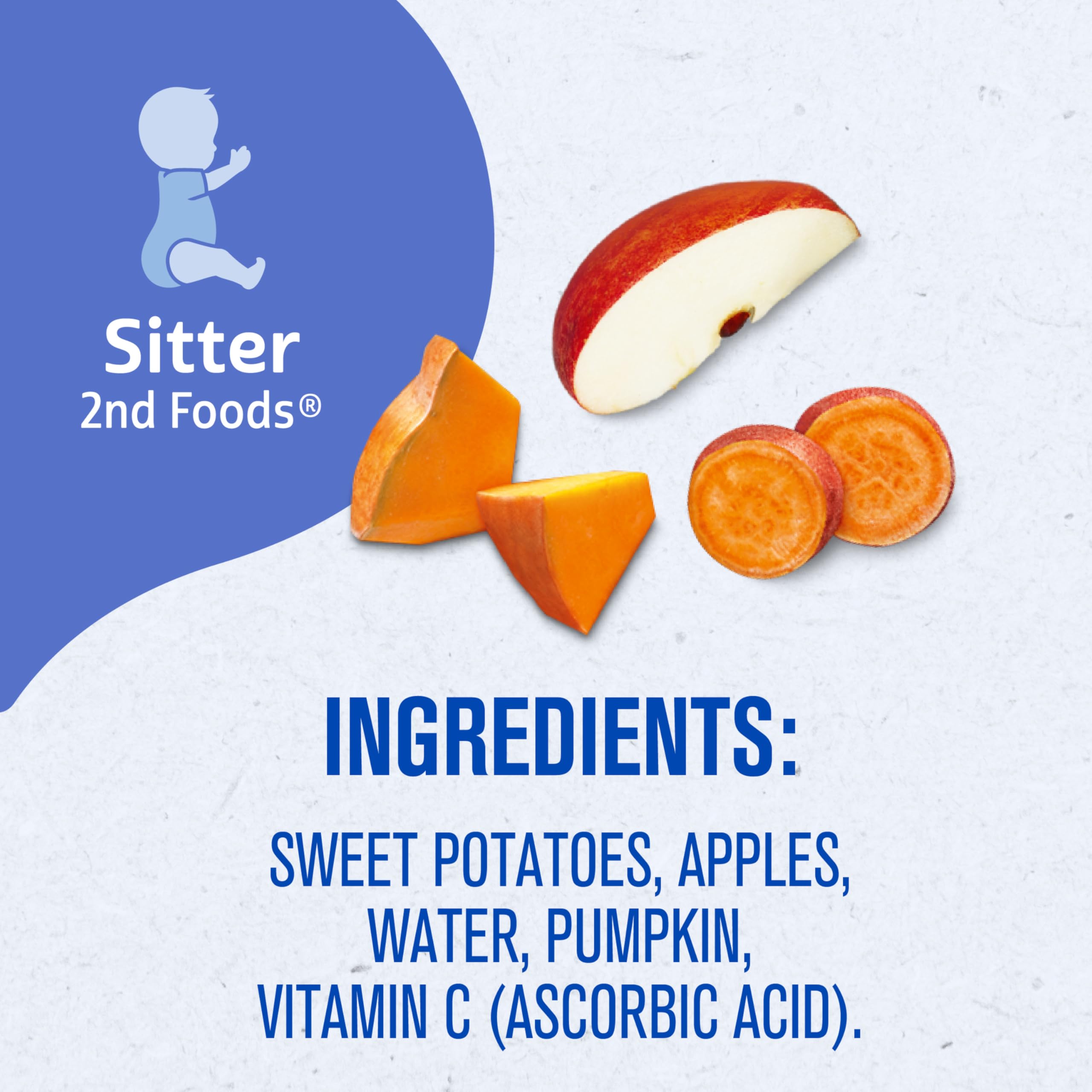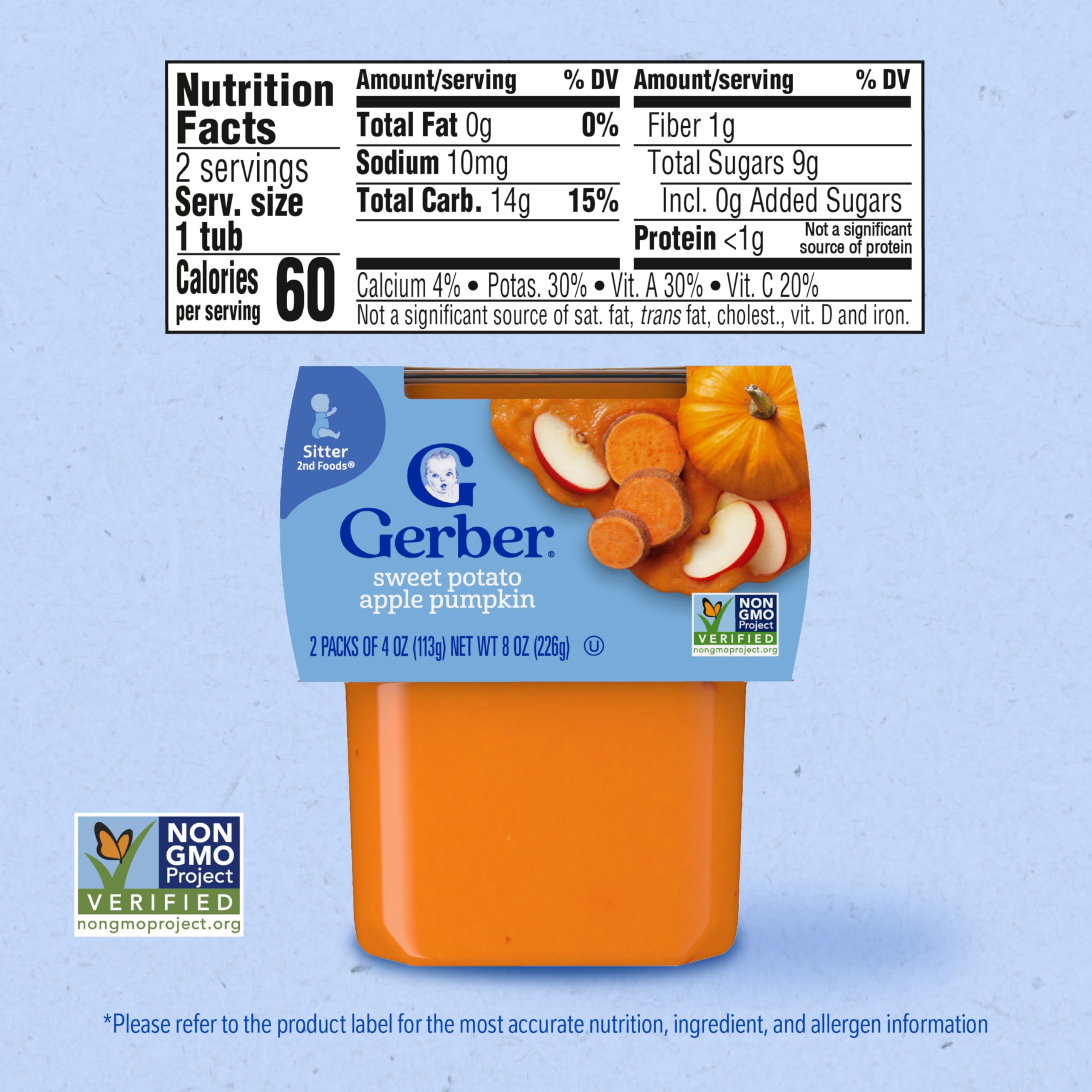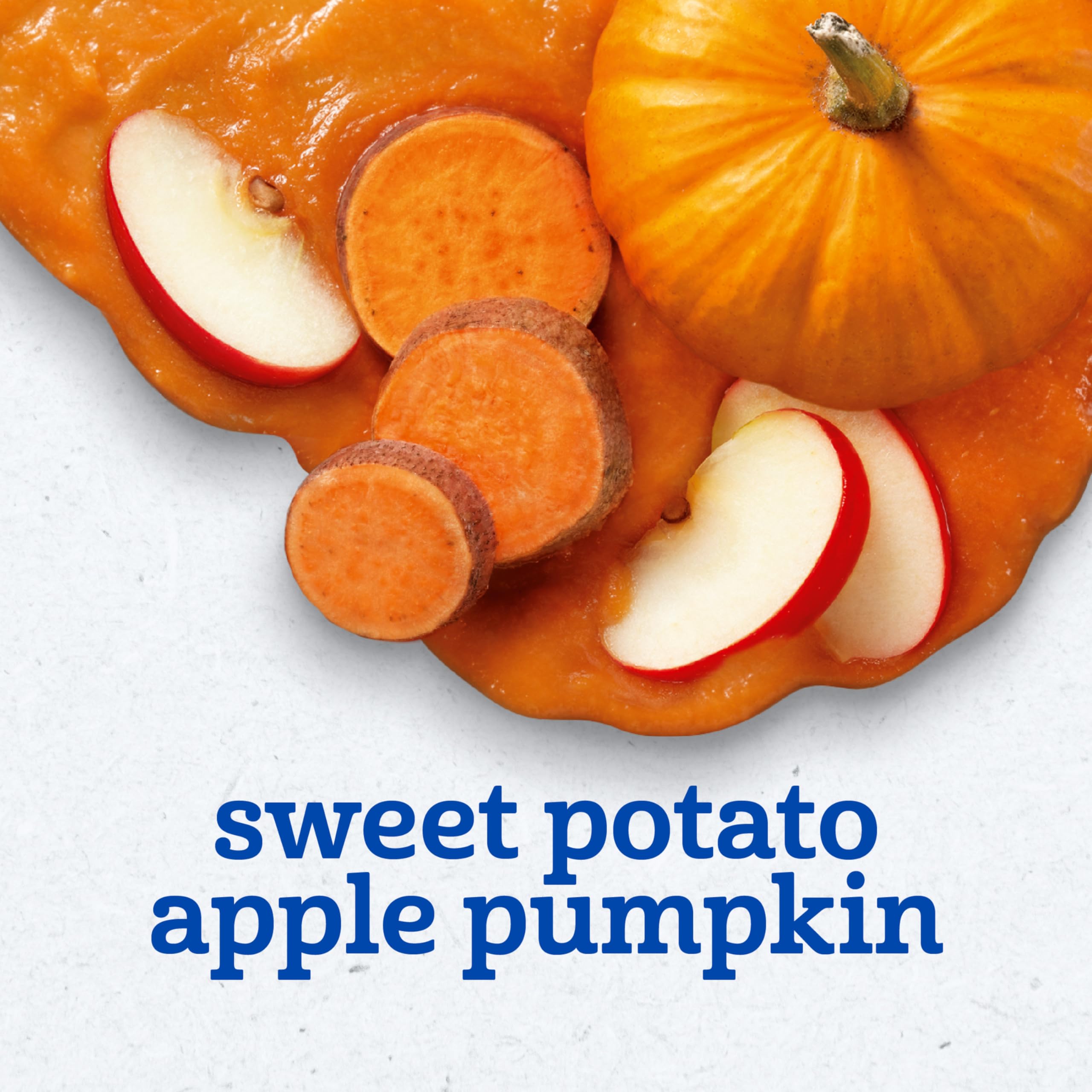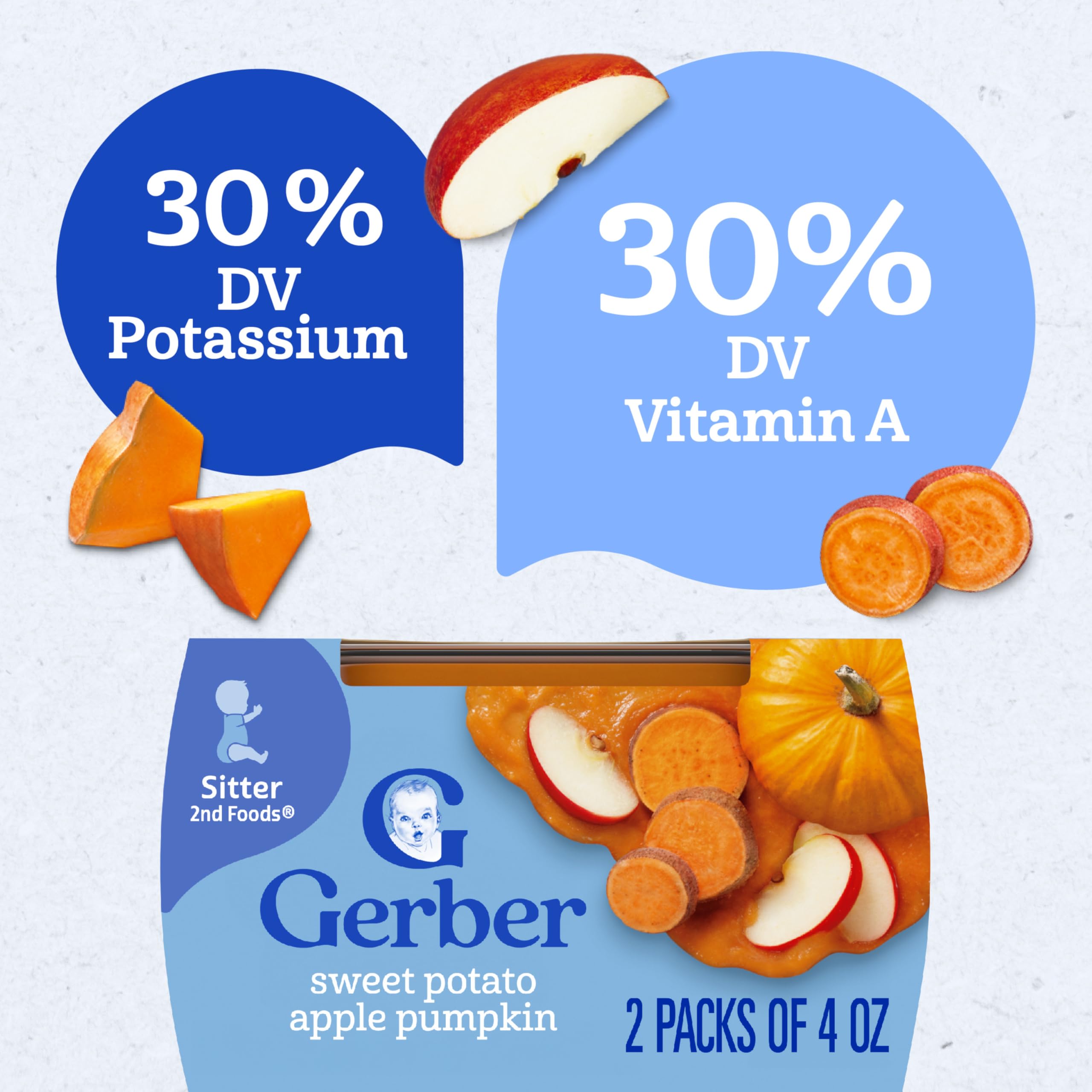 Gerber 2nd Foods Sweet Potato, Apple, Pumpkin baby food combines delicious fruits and vegetables to keep your little one smiling at mealtime. This puree includes 1/4 apple, 1/4 sweet potato and 2 teaspoons of pumpkin in each tub to provide 30 percent of your child’s recommended daily value for Vitamin A. All ingredients are non-GMO, and this unsalted puree food includes no artificial colors or flavors. Gerber 2nd Foods help expose babies to a variety of tastes and ingredient combinations, which is essential to help them accept new flavors. These BPA-free plastic tubs of Gerber food are convenient to carry in a diaper bag so you can easily feed your sitter on the go. Feed your little one straight from the container, or add some to a bowl and refrigerate the leftovers for up to two days.