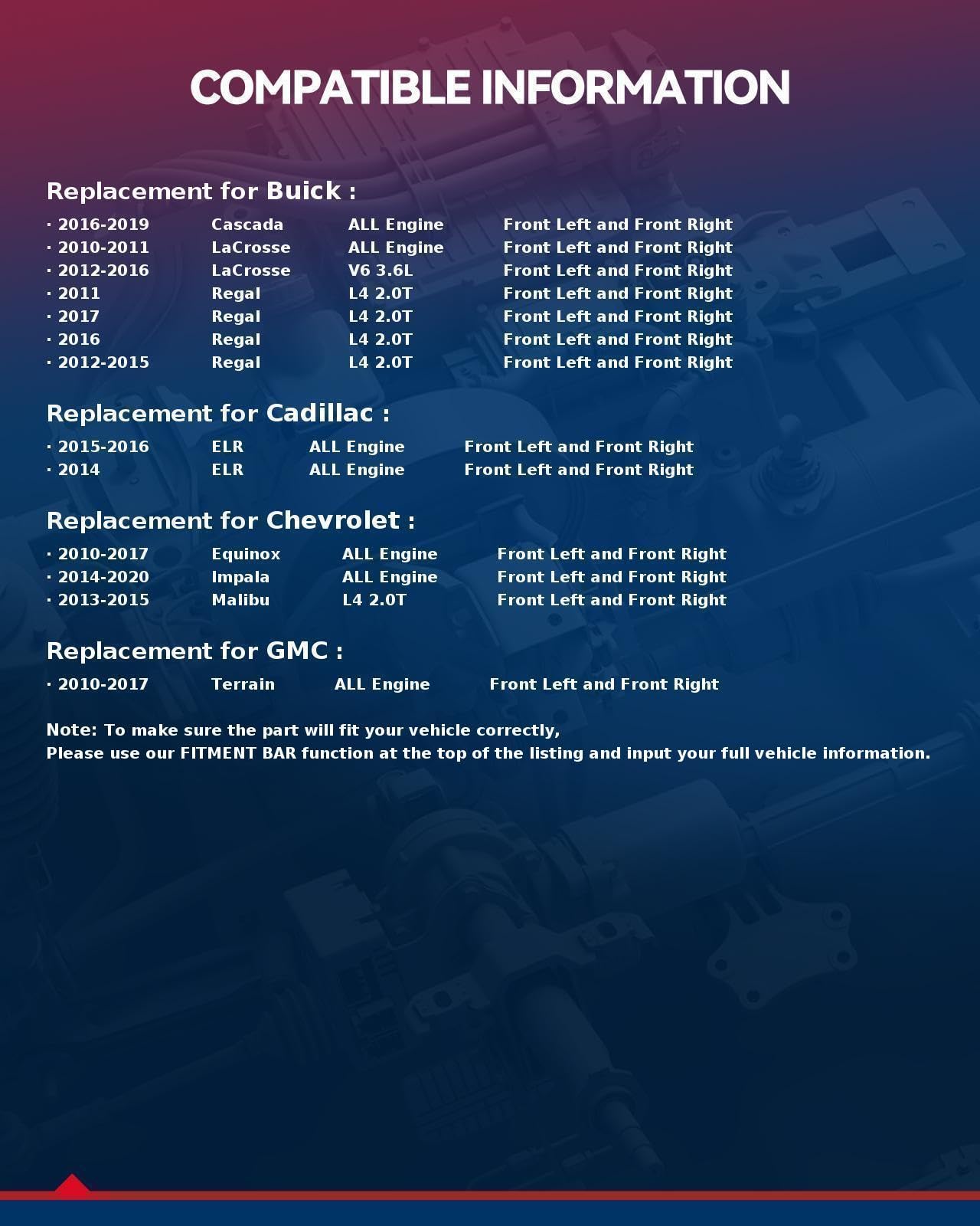 [Vehicle Fitment]: Compatible with Chevrolet Equinox 2010-2017, GMC Terrain 2010-2017, Chevrolet Impala 2014-2020, Buick LaCrosse 2012-2016 3.6L, Buick Regal 2011-2017 2.0T, Buick LaCrosse 2010-2011, Buick Cascada 2016-2019, Chevrolet Malibu 2013-2015 2.0T, Cadillac ELR 2014-2016---Front Left and Right, Driver and Passenger Side Side