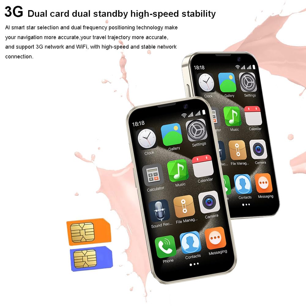 【Tiny But Functional Smartphone】-Phone Size is 94*47.4*12.5 mm. 3.0 Inch HD Screen. Easy to carry. The mini smartphone supports voice calls, video calls, camera, recording, email, MP3, GPRS, FM radio, touch screen, GPS navigation, message, SMS, MMS, video player, memory card slot, Internet browser, Google map, etc.