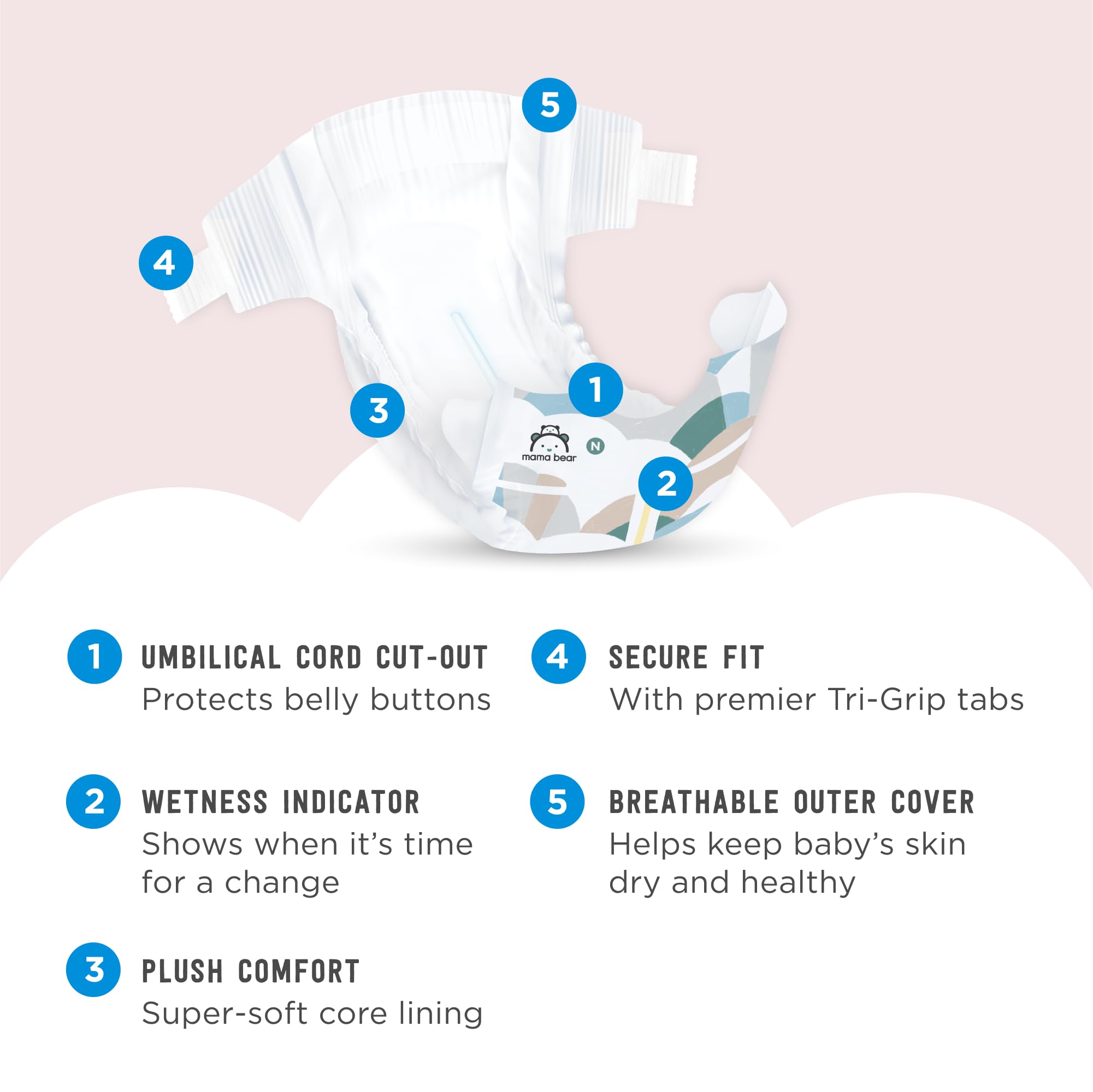 Stretch fasteners and elastic waistband with premier Tri-Grip tabs for a secure hold around your baby; Umbilical cord cutout to protect baby's belly button; Each pack contains two diaper designs, White and Cloud Dreams
