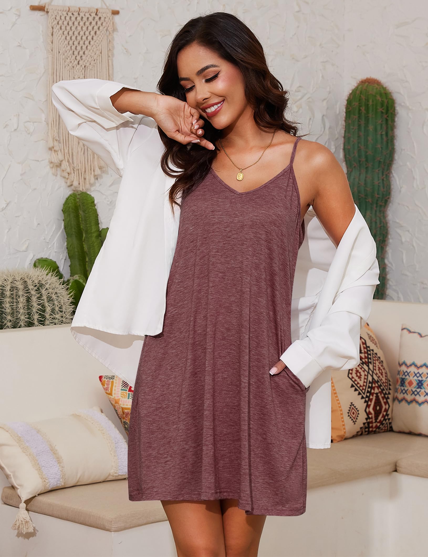 Features: This cotton slip chemise nightgown features delicate spaghetti straps and a captivating V-neck and back, along with two side pockets. Knee length and loose design make it perfect for people of various heights and body type!