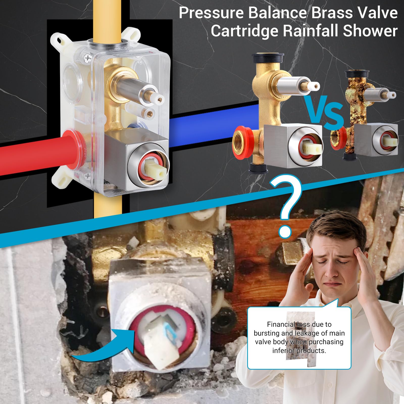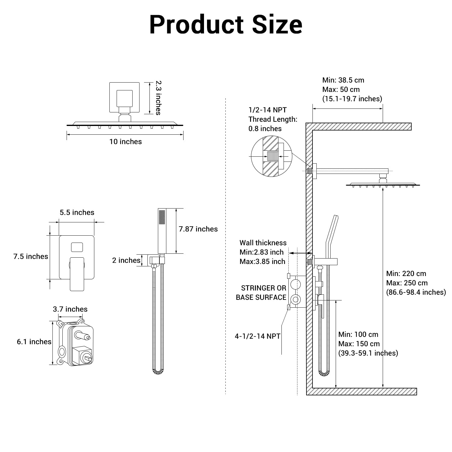Includes: 10-inch square fixed shower head, handheld shower head, shower arm rod, shower hose, shower base, and shower faucet rough-in valve body.