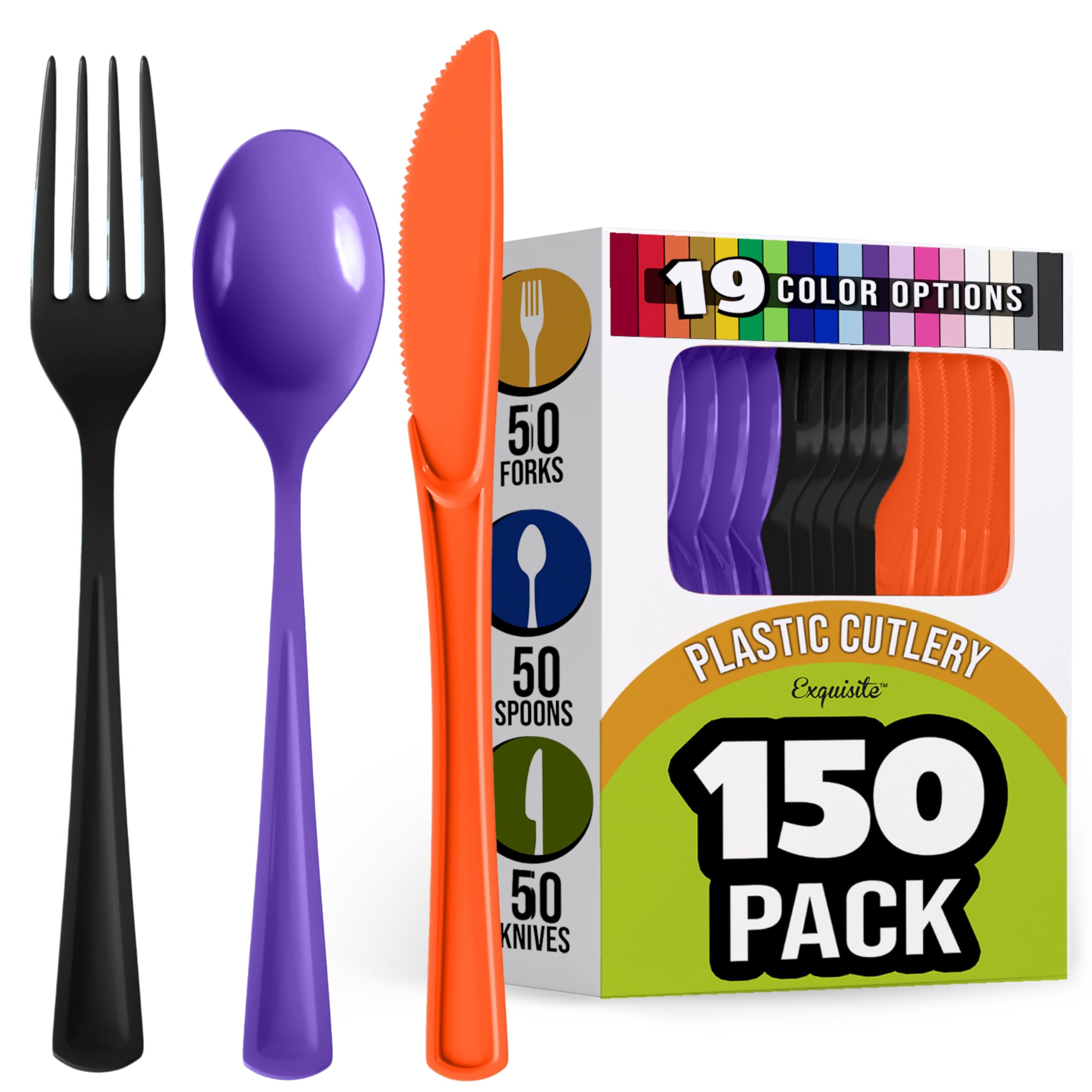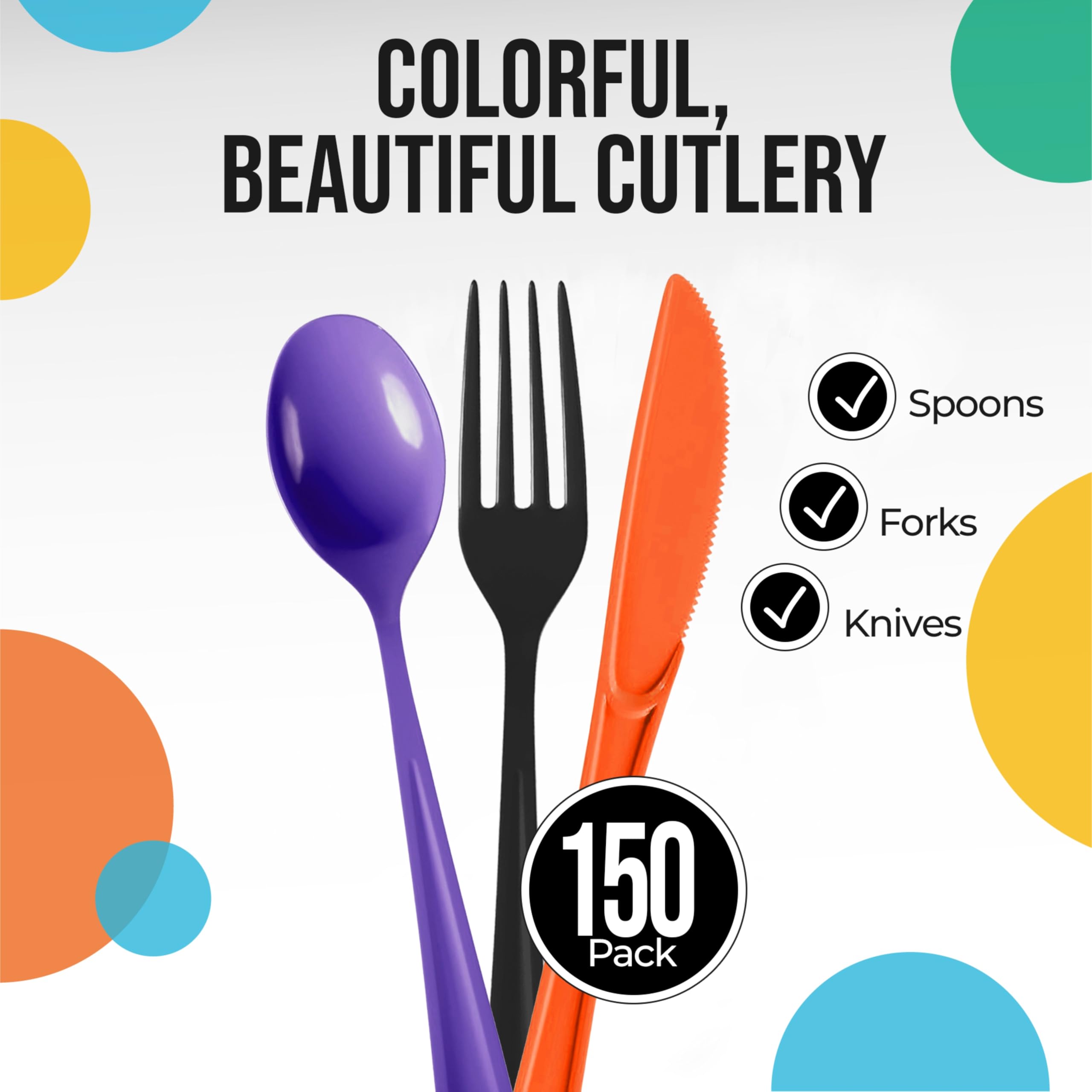 Includes: Each plastic silverware set contains 50 orange knives, 50 black forks & 50 purple spoons each measuring 7.5 inches, making it the ideal purchase for your upcoming party needs. A super convenient plastic cutlery set with all your plastic silverware in it. Offering multiple different color options, they are sure to match your decor.