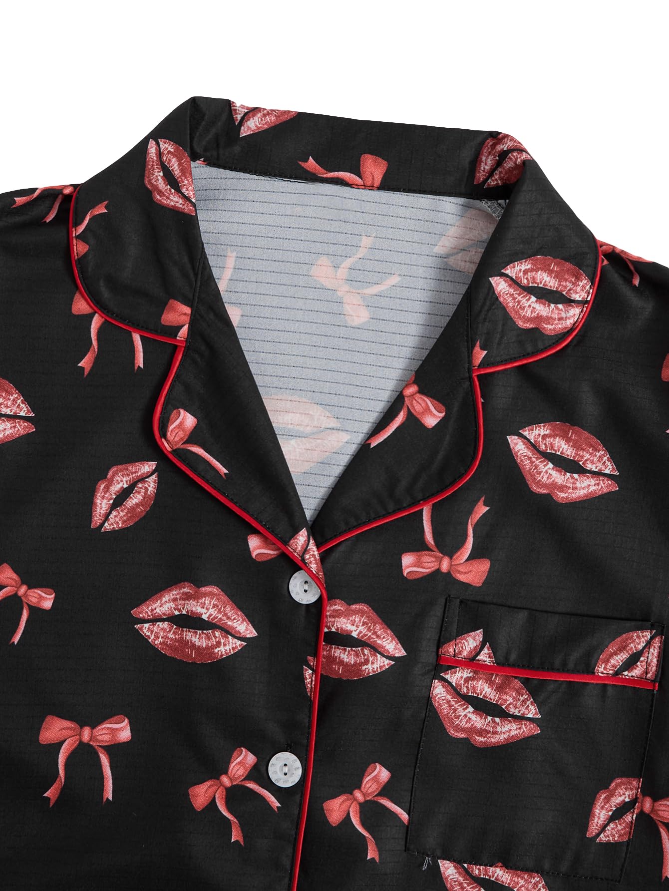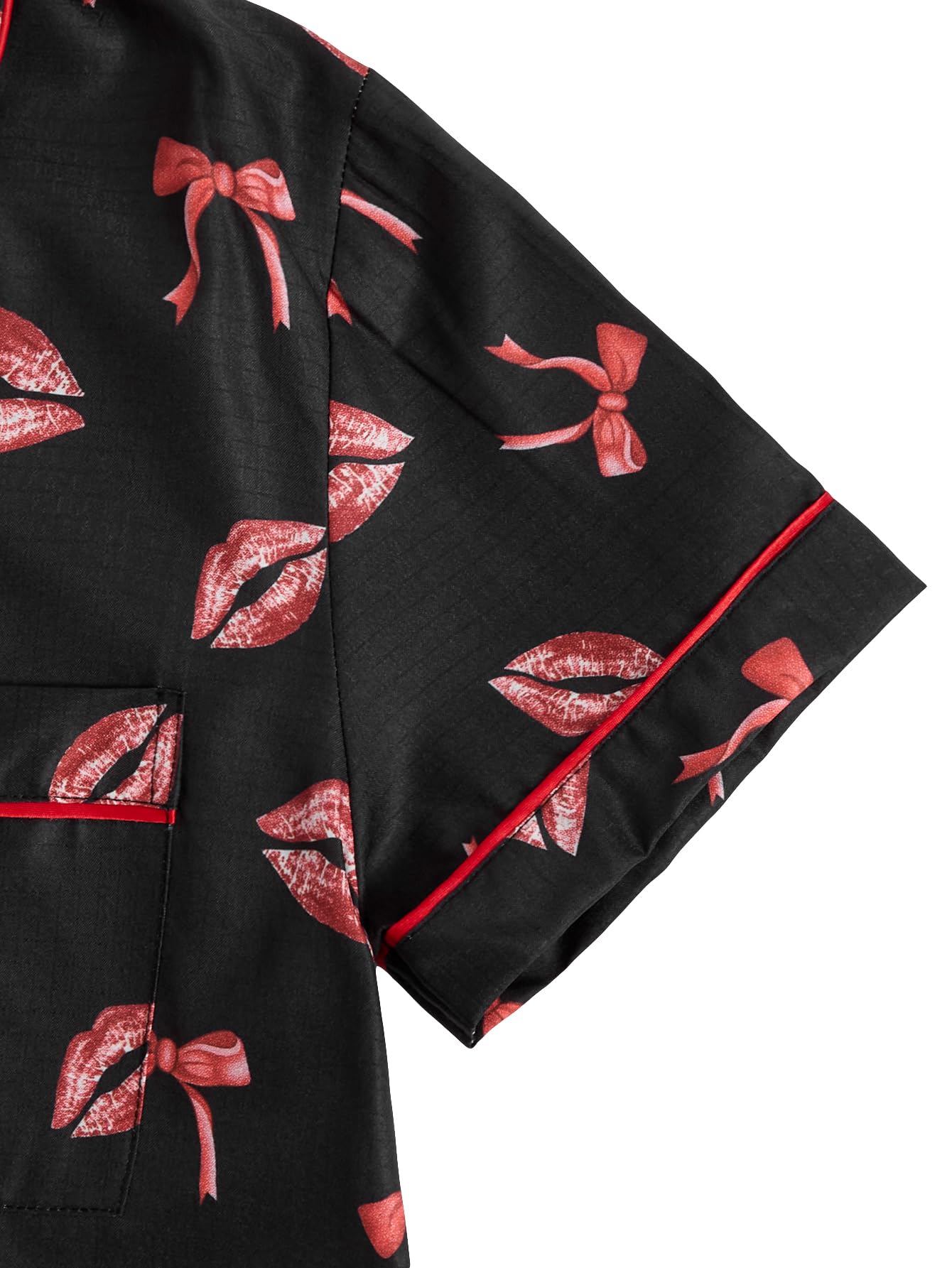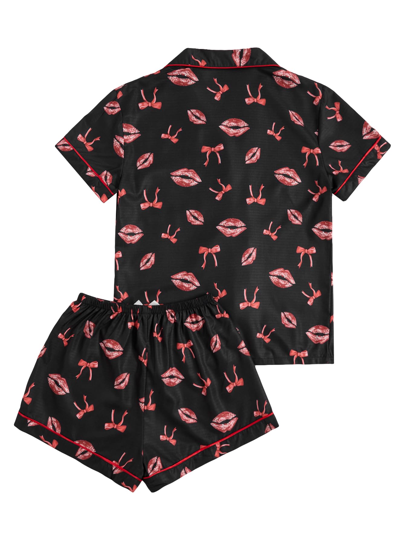 Lapel Collar, Short Sleeve, Print Pajamas, Bow Decoration, Button Down Top and Shorts, Loungewear Sets, Women's Sleepwear.