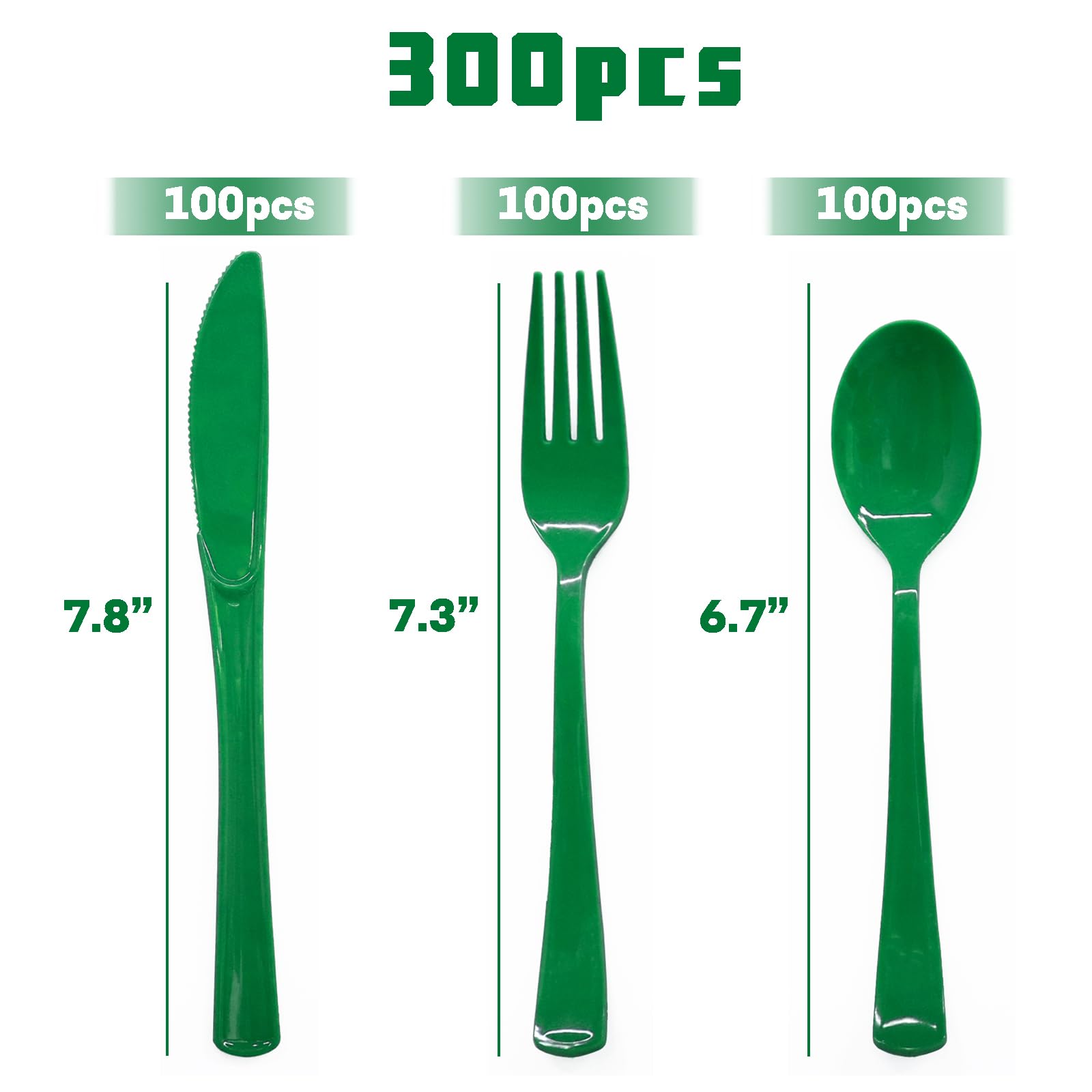 【Serves 100 Guests】: This green plastic silverware includes 100 green plastic forks, 100 green spoons and 100 green knives, total 300 heavy duty green plastic silverware.This pretty plastic silverware heavy duty will help brighten up your St.Patrick's Day, Christmas, wedding, birthday, shower or whatever your celebrated event is. The greater news is, it is disposable for fast cleanup during the event and afterwards.