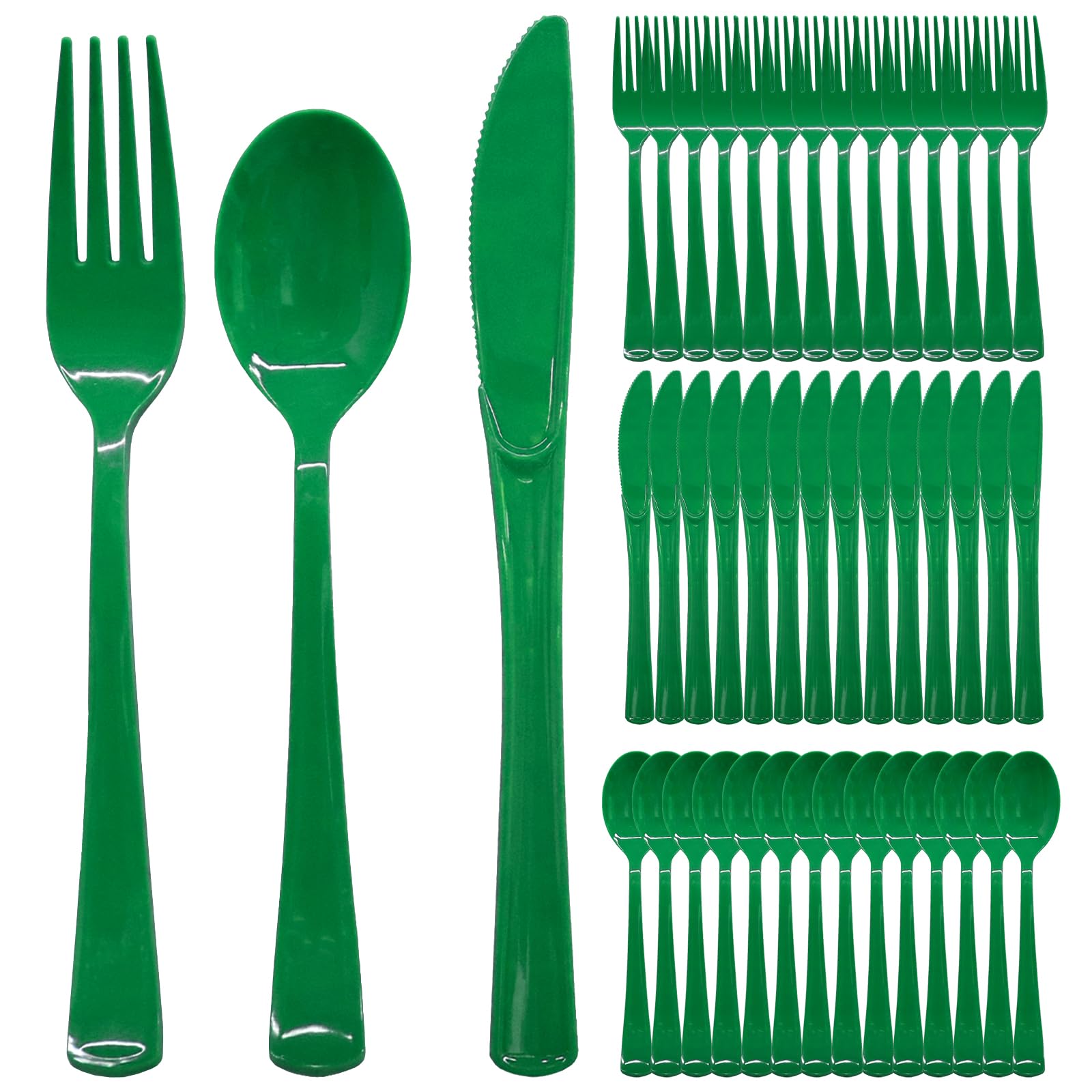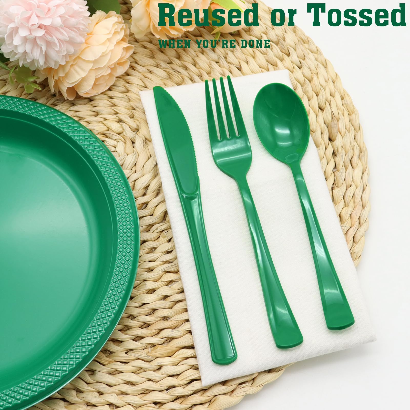 【Convenient and Reusable】The green plastic silverware is disposable and can easily be thrown away after the party, eliminating the hassle of a long wash and clean-up so you can focus on having a great time with friends and family. Of course, if you want to continue using the green plastic silverware, simply wash it in soapy water to restore its lustre and get it ready for your next party.