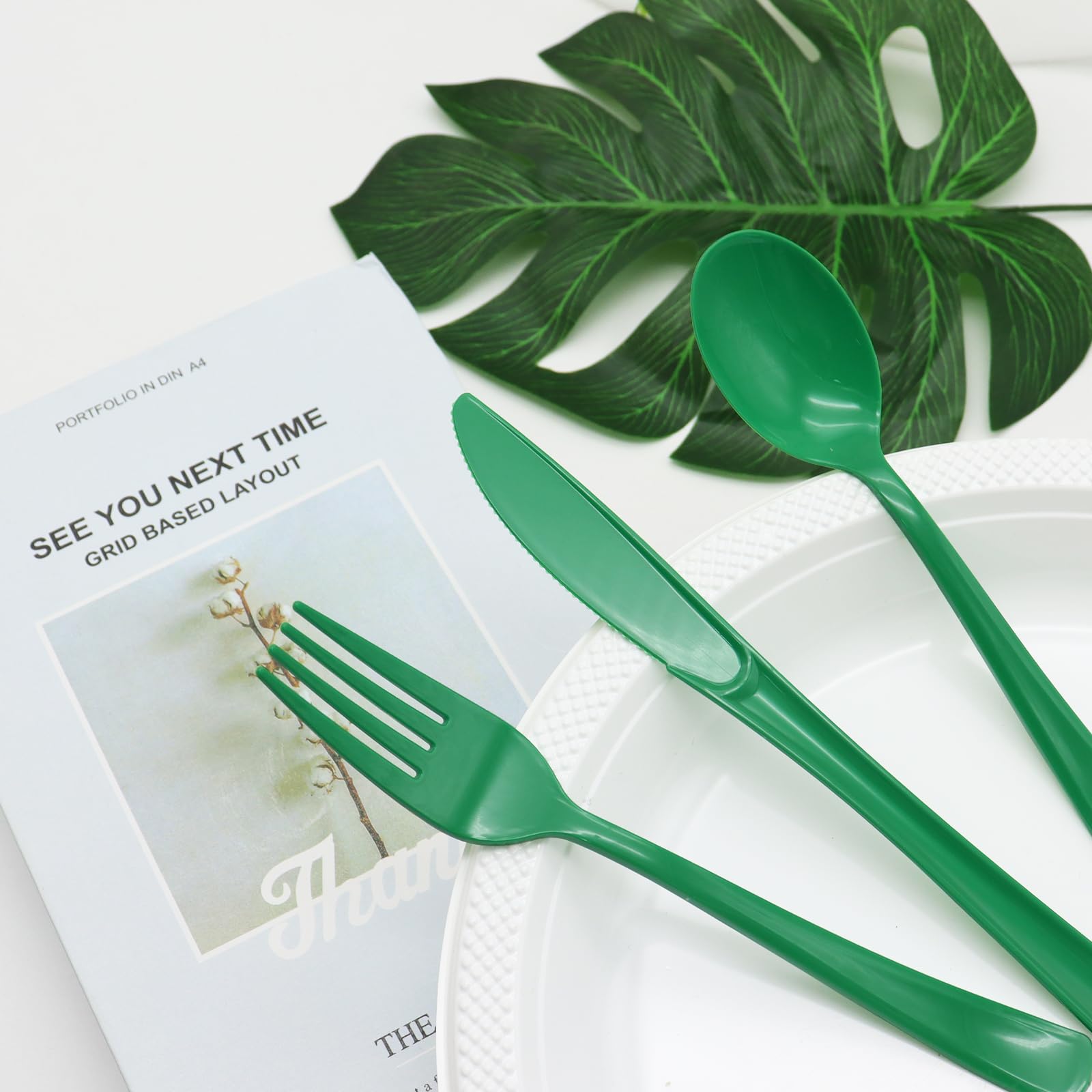 【High Quality Plastic Materials】: The plastic silverware is made of food-grade plastic material, which is non-toxic and harmless and can be in direct contact with food. Thickly designed at the handle, it is less prone to breakage and deformity, and has excellent durability and reliability. High-temperature resistant and suitable for all types of food, whether cutting meat or scooping soup, the green plastic silverware meets customers' needs.