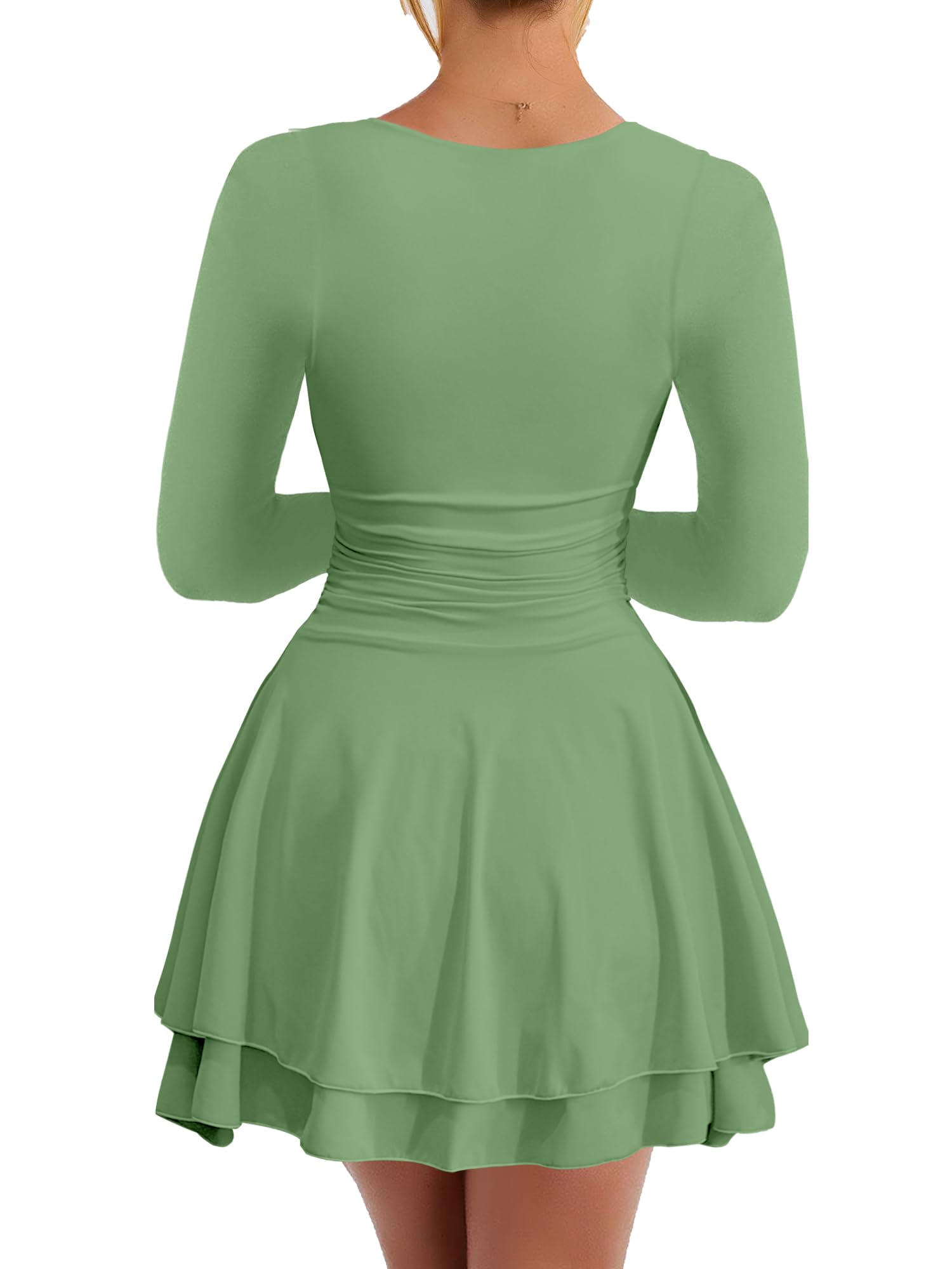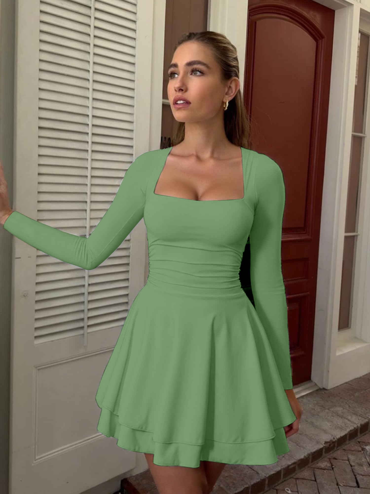 This club short dresses feature square neck, long sleeve, above knee mini length, ruffle hem, ruched basque waist