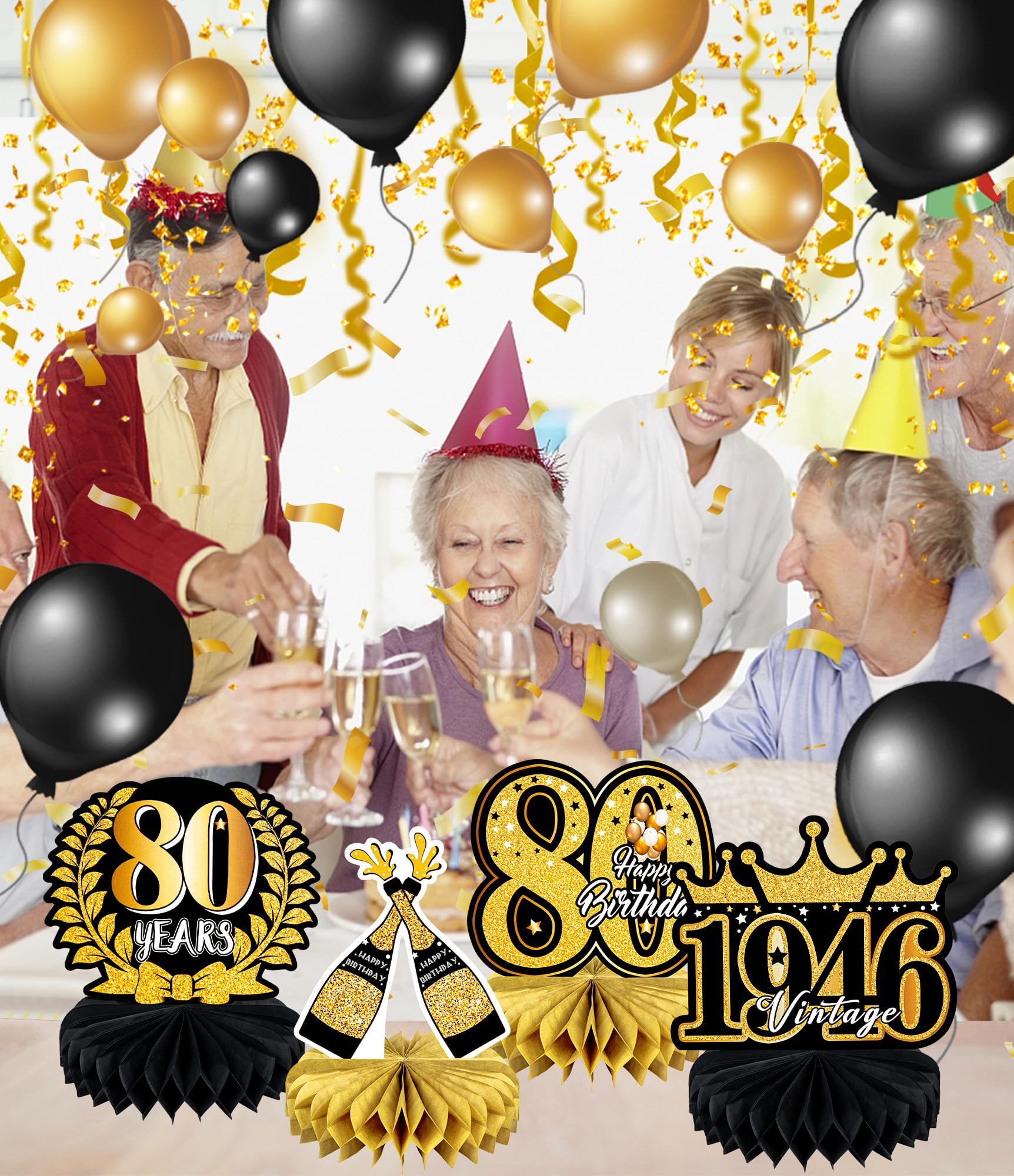 β¨80th BIRTHDAY THEME PARTY: The 80th birthday decorations are double-sided printing and retro black gold design. The patterns on the paper are printed with many related elements, such as 1946, cakes, balloons, 80 years, happy birthday. Create a cheerful and surprising 80 birthday atmosphere for you