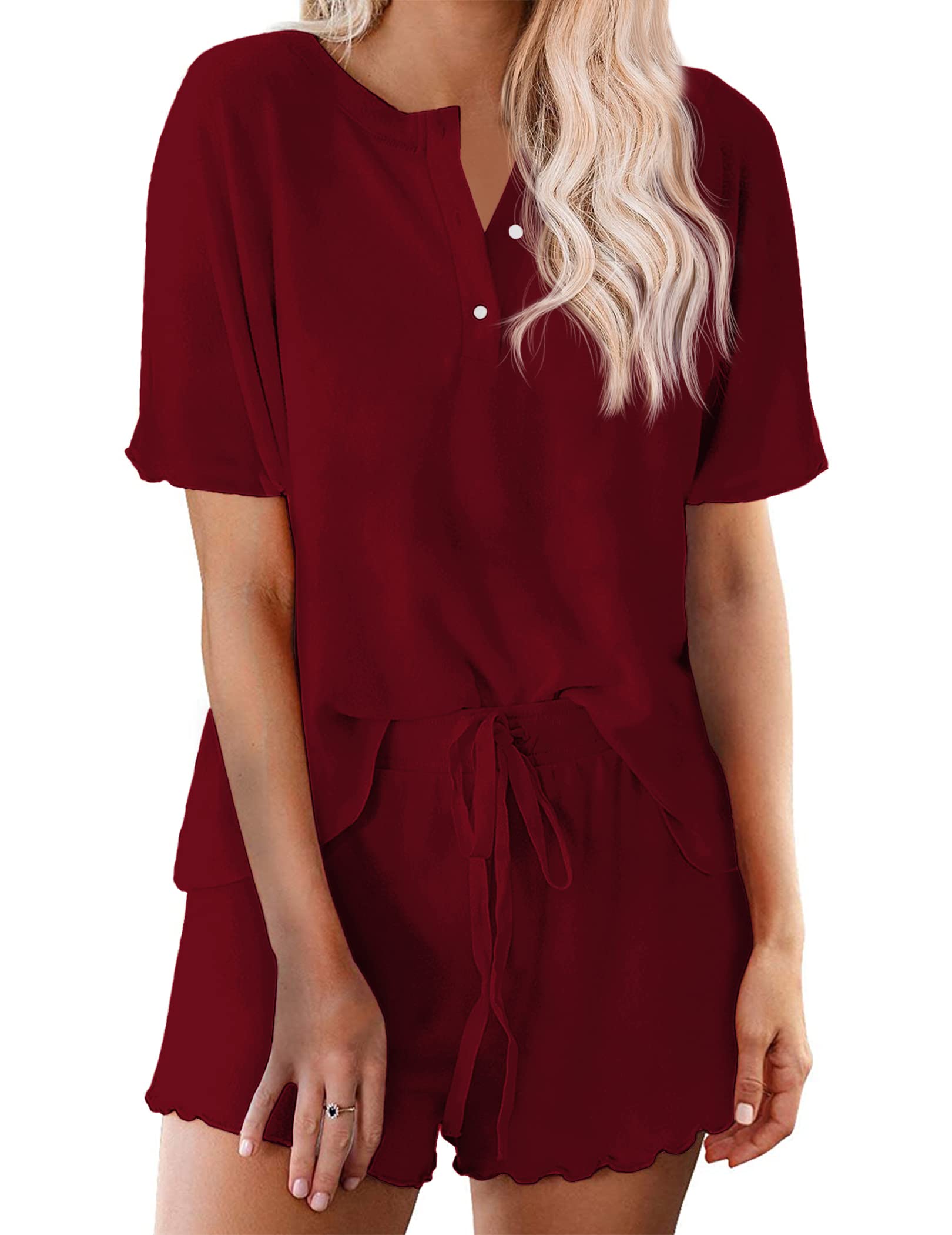 [Pajamas Features]: Henley neckline with button, short sleeve pajamas tops with ruffled pajamas shorts. Drawstring elastic waist, can be adjustabled depend on your need. This 2 piece pj sets nightwear sleepwear is perfect for women, juniors, ladies and teens