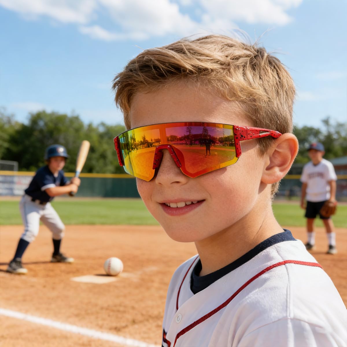 KIDS BASEBALL SUNGLASSES - fashion polycarbonate frames, enhancing the youthful style of teenagers. The wrap-around design offers better eye protection, providing a broader field of vision while effectively shielding the eyes from dust, wind, and other elements, ensuring comprehensive eye protection. Suitable for kids aged 6-12.