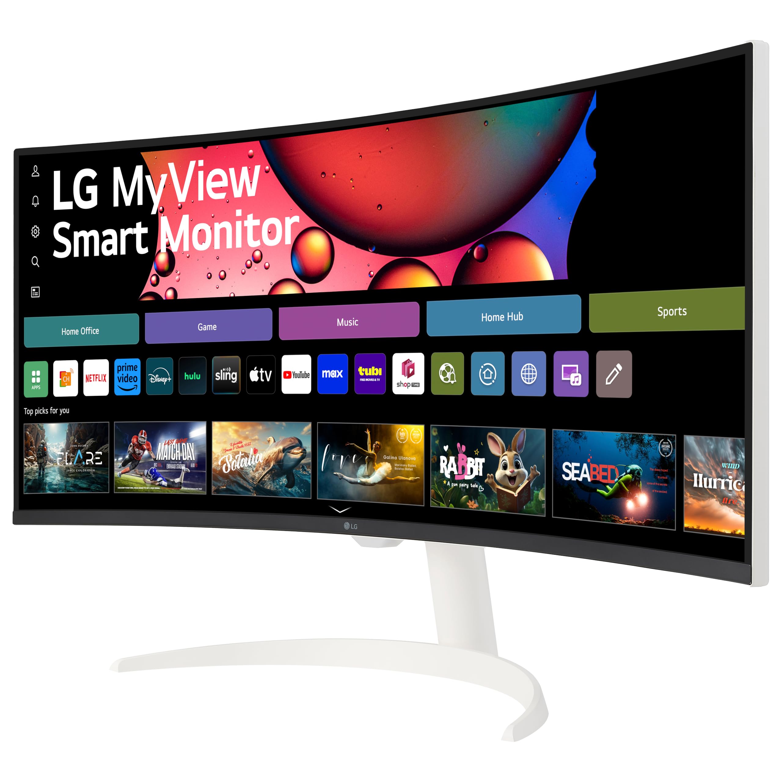 LG 34SR63QA-W 34 inch Smart Curved Monitor with Streaming TV, QHD, UltraWide Screen, USB Type-C 65W PD, 1800R, webOS, HDR10, 100Hz, Built-in Speaker, AirPlay2, Screen Share, Bluetooth, White ¹Internet connection and subscription to streaming services are required. ²Internet connection and subscriptions to streaming services are required. Amazon, Prime Video and all related logos are trademarks of Amazon.com, Inc. or its affiliates. Amazon Prime membership and/or Prime Video fees apply. See primevideo.com/terms for details. HBO Max 2023 Warner Media, LLC. All Rights Reserved. HBO Max is used under license. Number of LG Channels subject to change. ³Home Office services support only Microsoft 10 and 11 or higher. Microsoft 365 and Google registration and subscriptions may be required. Separate services may require payment for subscription. Supported service may vary by country. ⁴Your Apple device must be connected to the same Wi-Fi network as your monitor. Apple, the Apple logo, AirPlay, Apple TV, and HomeKit are trademarks of Apple Inc., registered in the U.S. and other countries. This LG Smart Monitor supports AirPlay 2 and requires iOS 12.3 or later or macOS 10.14.5 or later. Internet connection and subscriptions to streaming services are required for streaming services. ⁵Keyboard and mouse available separately.