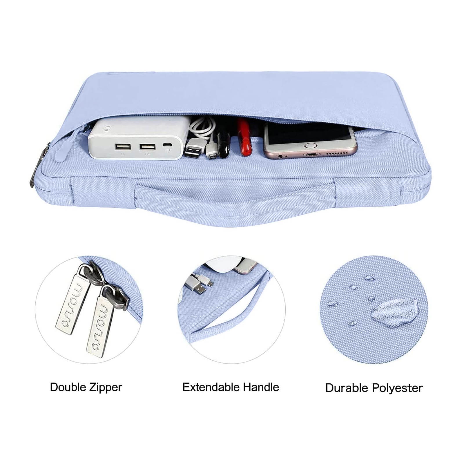 The 360 degree protective shockproof laptop sleeve with handle carrying bag internal dimension: 13.39 x 9.25 x 0.79 inches (L x W x H); external dimension: 13.98 x 9.84 x 0.79 inches (L x W x H). The front side pocket dimension: 11.61 x 9.25 inches (L x W). Made of polyester material, protect your laptop against accidental spills. Slim and lightweight, does not bulk your device up and can easily slide into your briefcase, backpack or other bag. Ideal for business, daily and travel.
