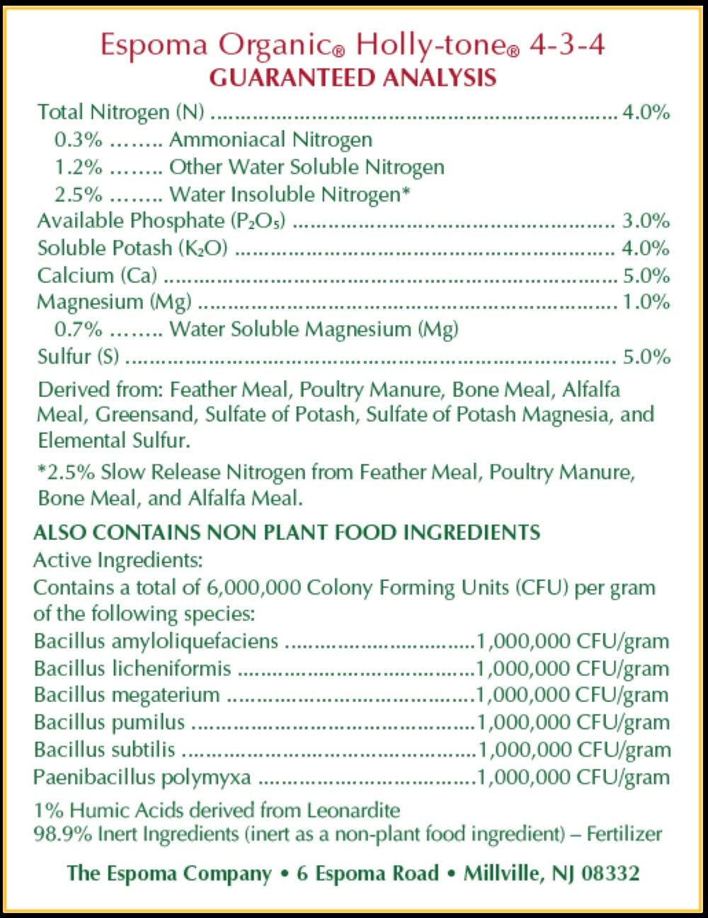 CONTAINS: Holly-tone is a rich blend of the finest natural & organic ingredients enhanced with our exclusive Bio-tone formula; 4-3-4 Fertilizer analysis with 5% sulfur. Holly-tone is environmentally Safe - No sludges or toxic ingredients.