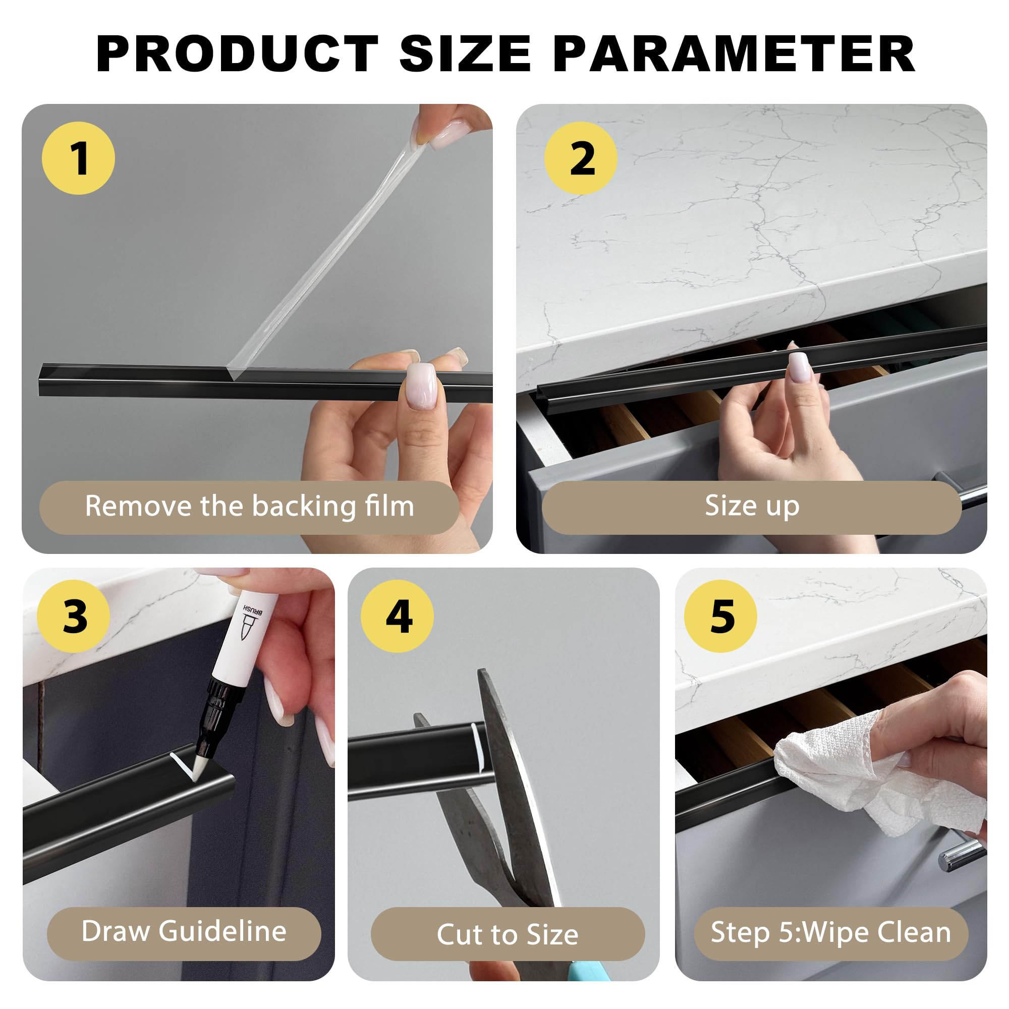 Effortless Install: ① Peel backing film ② Measure & trim ③ Snap on – no adhesives needed.