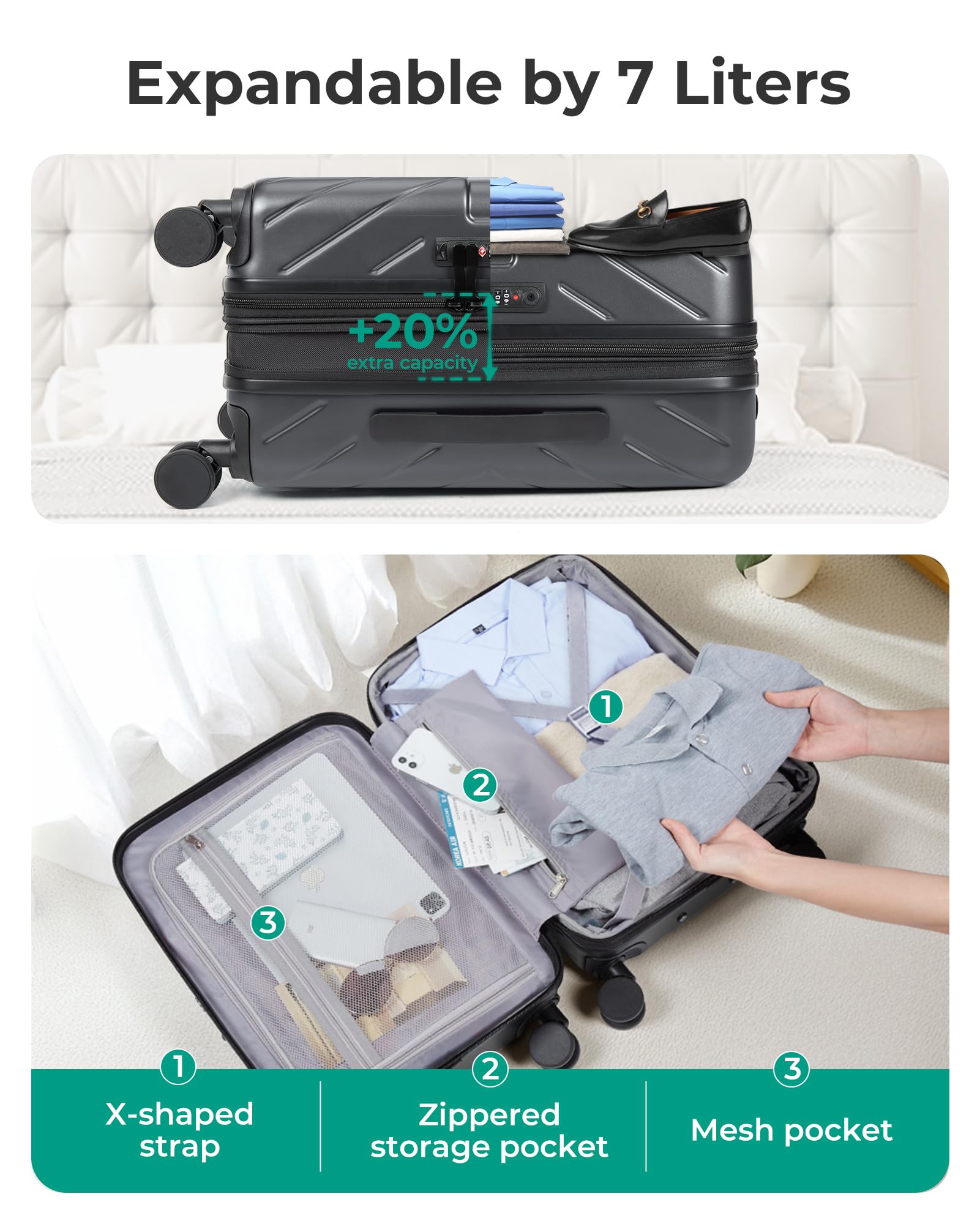 Room For More: BAGSMART hard case suitcase is designed to fit more into your trip. The 2 main compartments of travel luggage with compression cross straps store all your clothes and belongings and keep clothing wrinkle-free, items neatly in place. Individual built-in small pocket is for small items. Generously sized, thoughtfully placed designs maximize every inch of storage, meaning you can get more out of every trip with your carry-on.