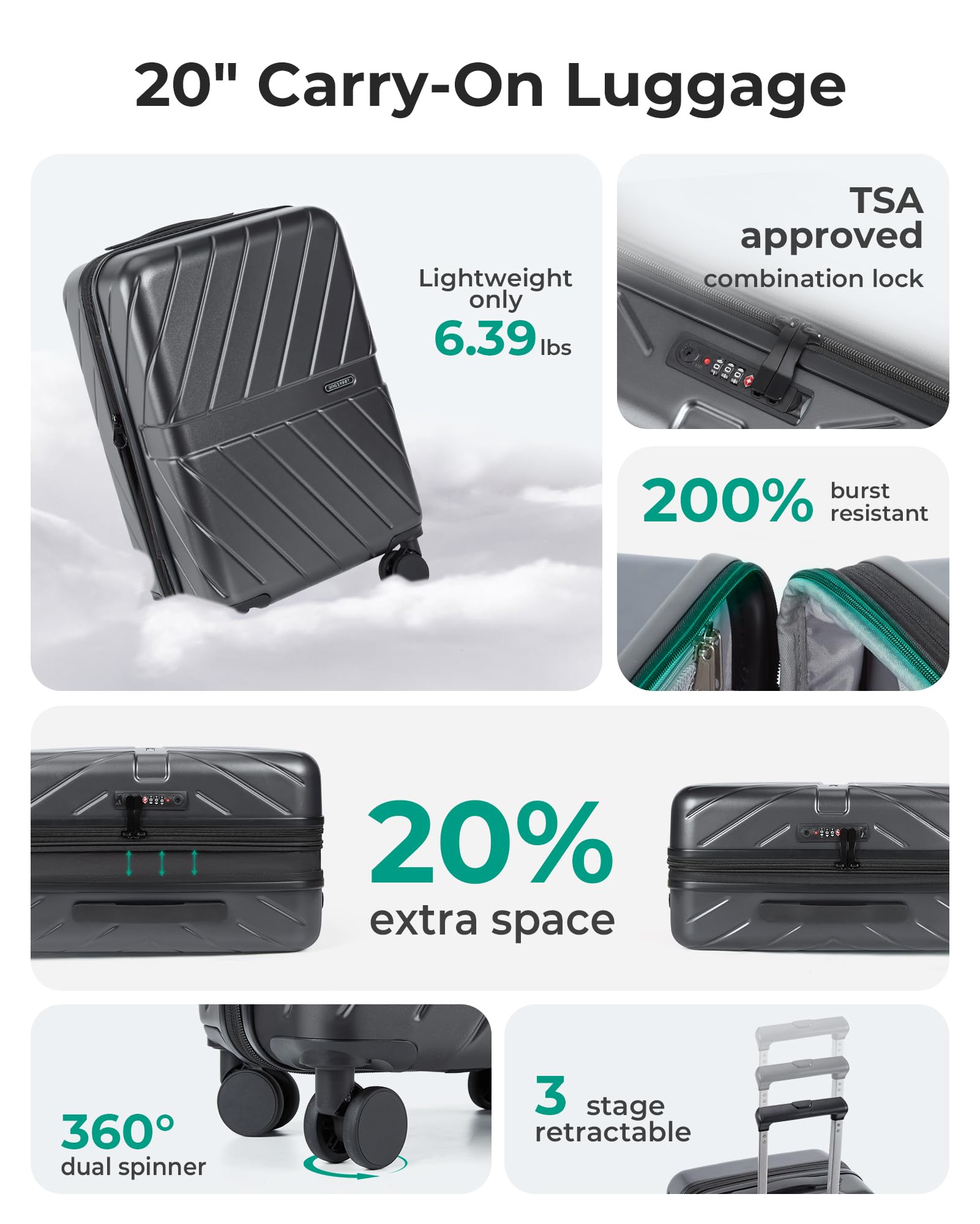 All In The Details: A sturdy 4-stage retractable high-grade aluminum tubes handle that offers multiple height positions. The main compartment is protected by a TSA-approved combination lock for extra safety. Move smoother than ever before with newly designed 360° spinner wheels to ensure a smooth ride. To ensure the highest level of quality and durability, we put our products and materials through thousands of experimental tests. Production of 20 inch carry on luggage, we mean it!