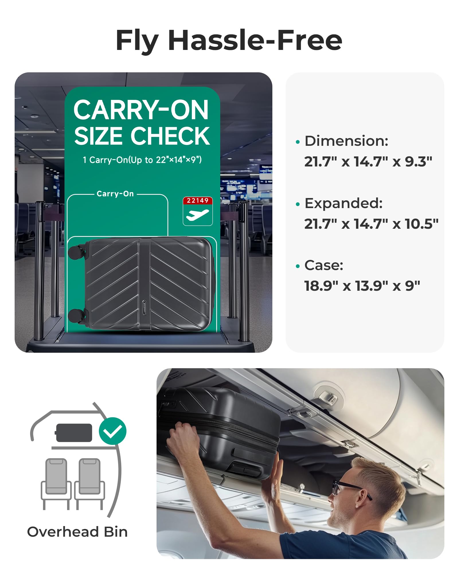 Airline Approved Luggage: Dimensions: 21.7 x 14 x 8.7 in (wheel and handle height included). Volume: 35 L. Weight: 6.39 lbs. The 20" carry-on luggage size is designed to meet the airline requirements for most major airlines as a carry-on suitcase that can be placed in the overhead bin of almost any flight, anywhere in the world. No more paying for temporary consignments.