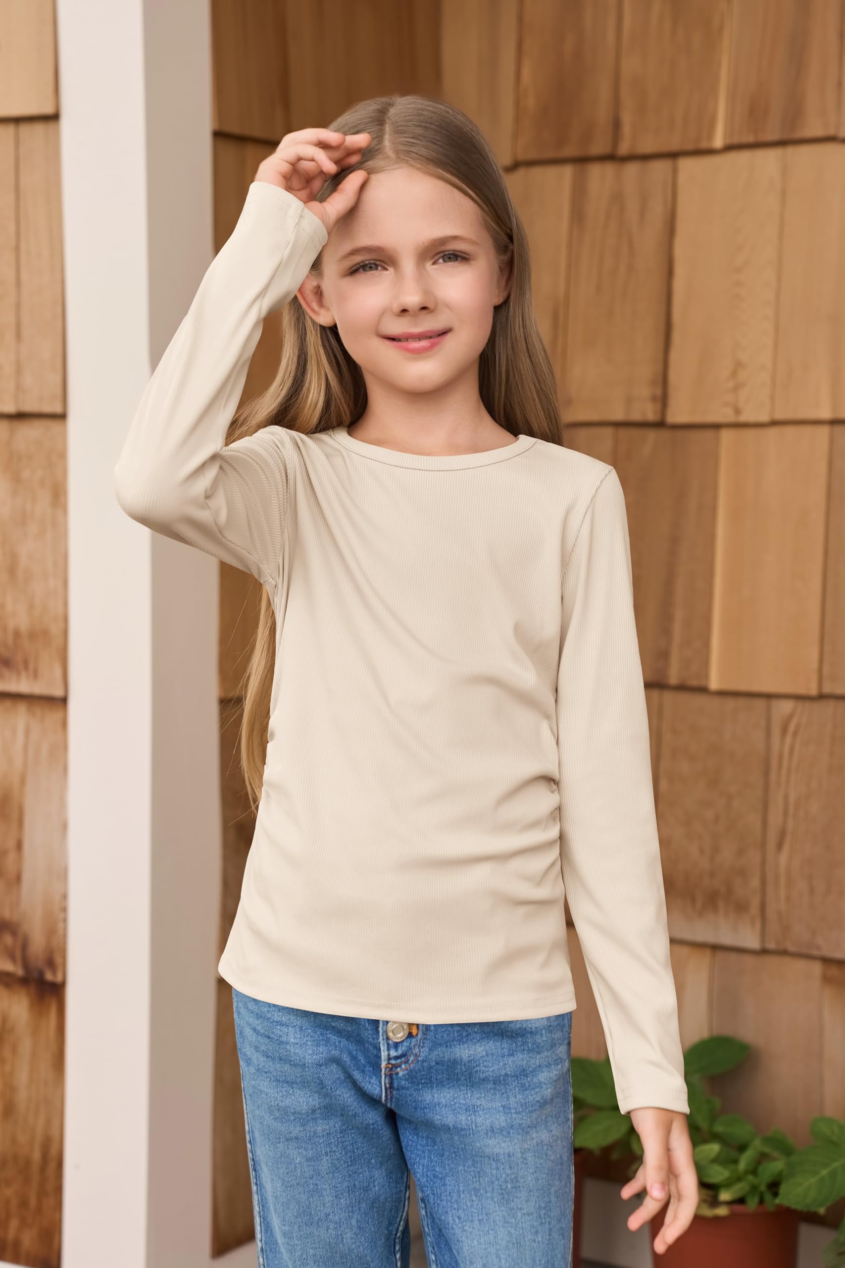 Features: Fitted Basic Tee for girls, long sleeve, round neck, ribbed knitted fabric, ruched detail two side, solid color, cute and fashionable look. Designed to delight girls aged 4-15!