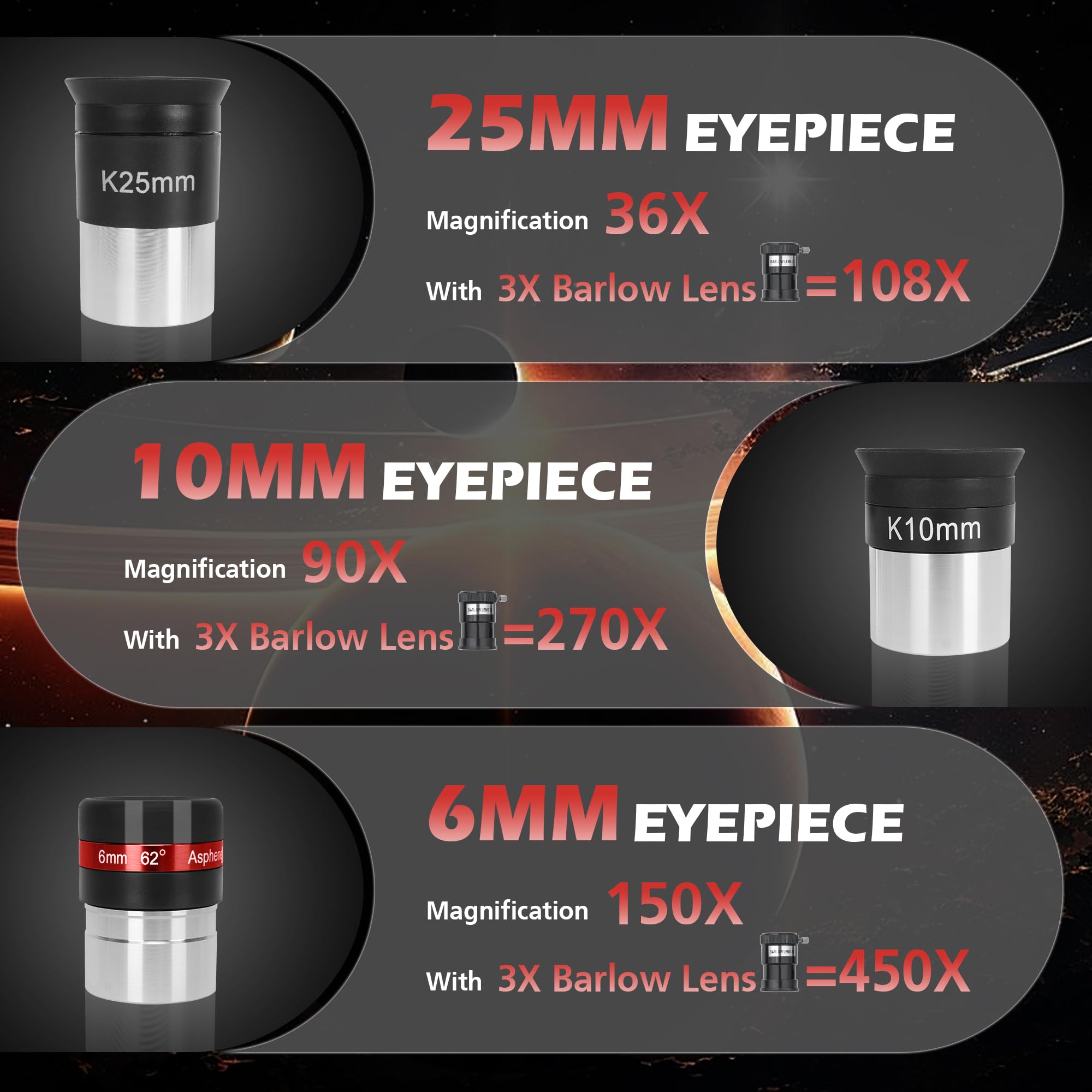 Magnification 36X-450X: This telescope for adults features 3 eyepieces (25 mm/10 mm/6 mm) and a 3x Barlow lens, offering 36X-450X magnification with a 900 mm focal length. It includes a 5x24 finder scope, phone adapter, and a stargazing mount