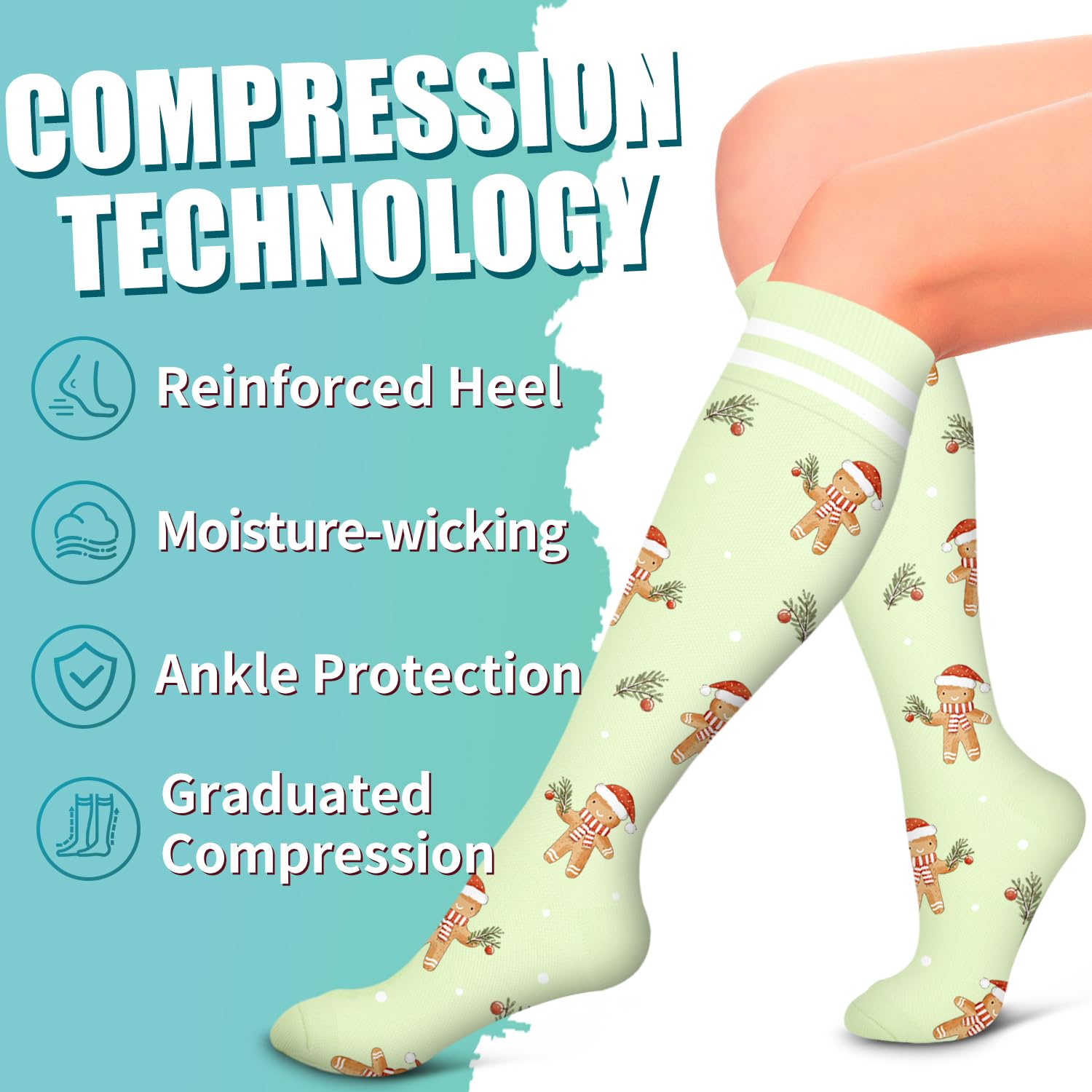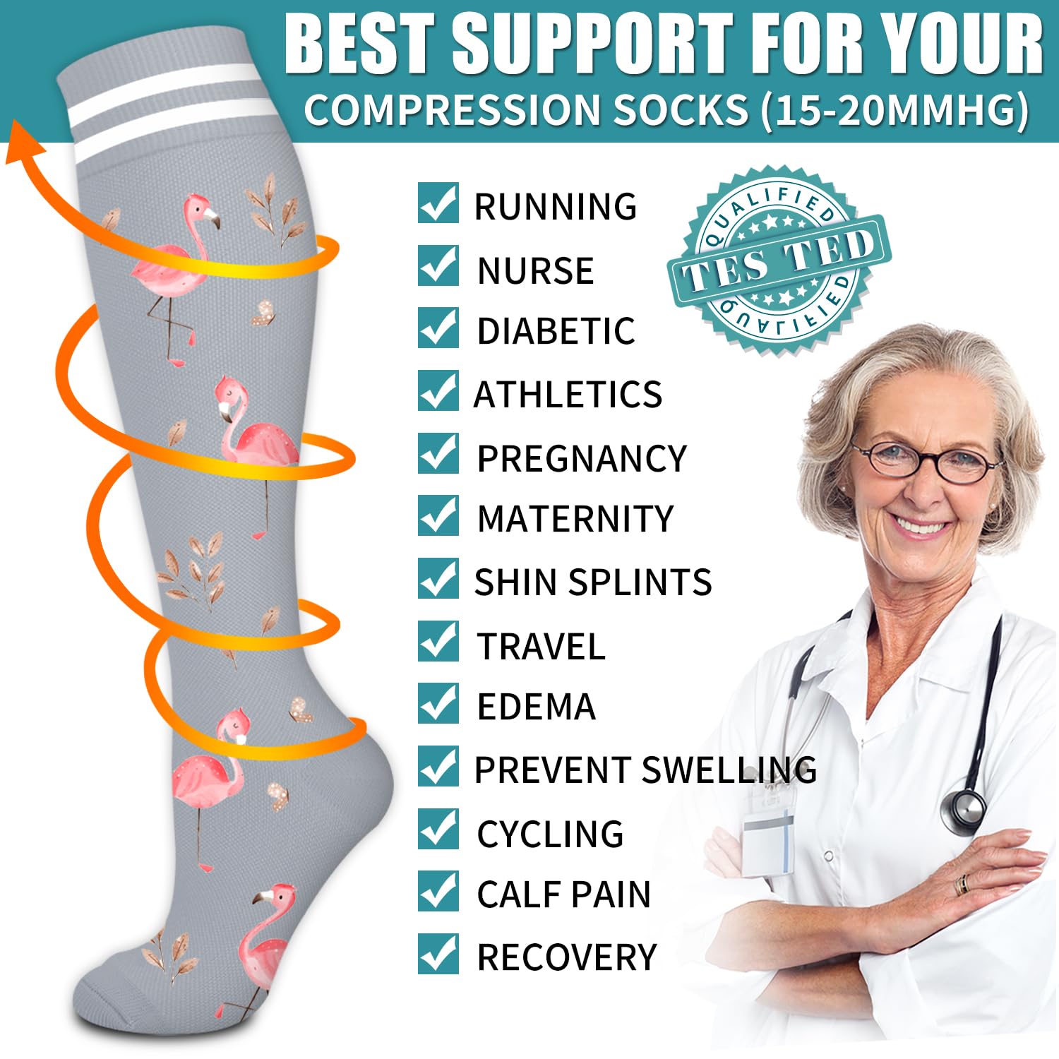 COMFORTABLE-Made from 85% Nylon and 15% Polyester.Our compression socks for women are incredibly soft,breathable,and moisture-wicking,provides a perfect composition between comfort and grip.High performance material and temperature control,keeping your muscles cool during workouts and warm during rest.It can gently wraps around feet,ankles,and legs to provide enough support to stimulate blood flow.Don't hesitate to wear compression socks for women daily.They can be a great relief!