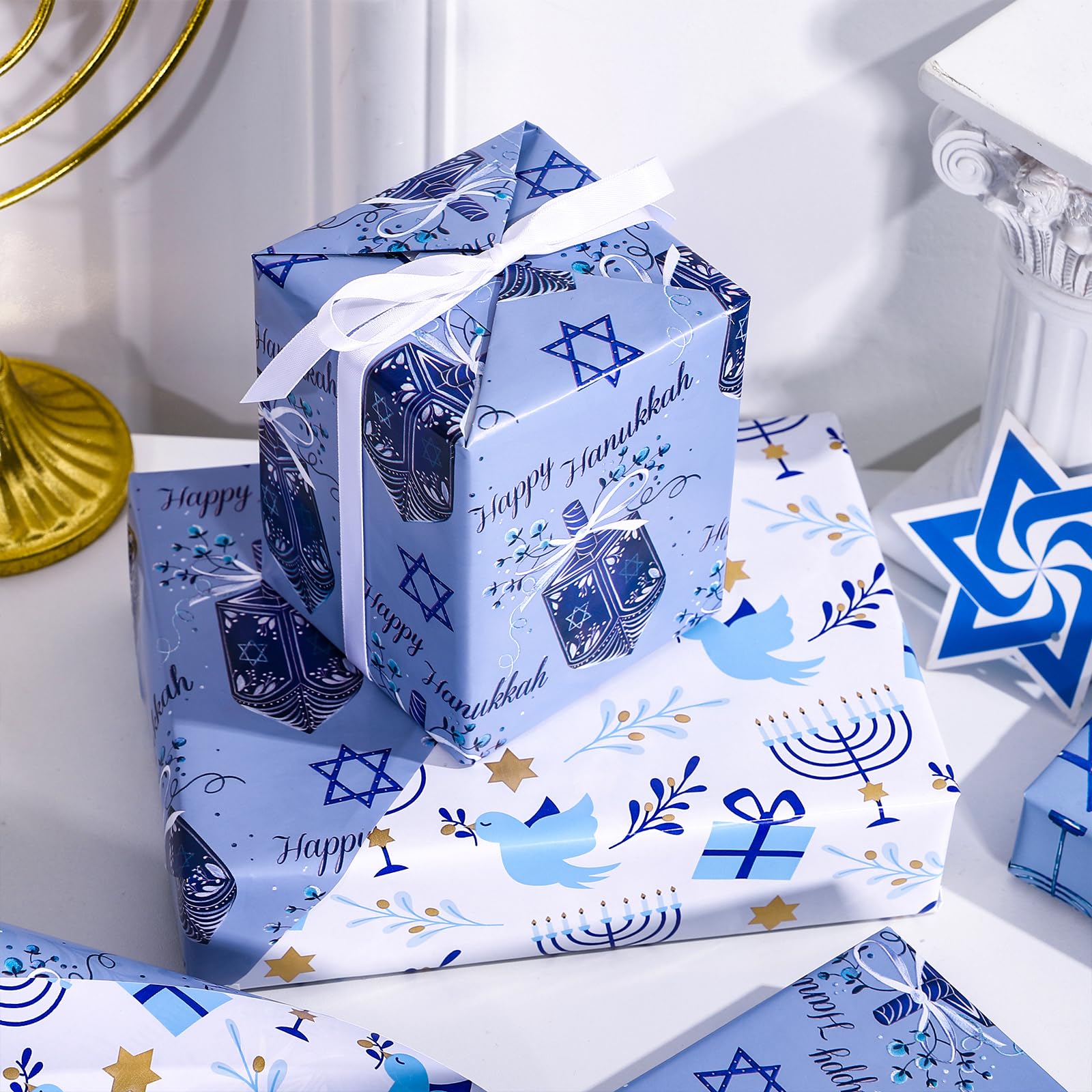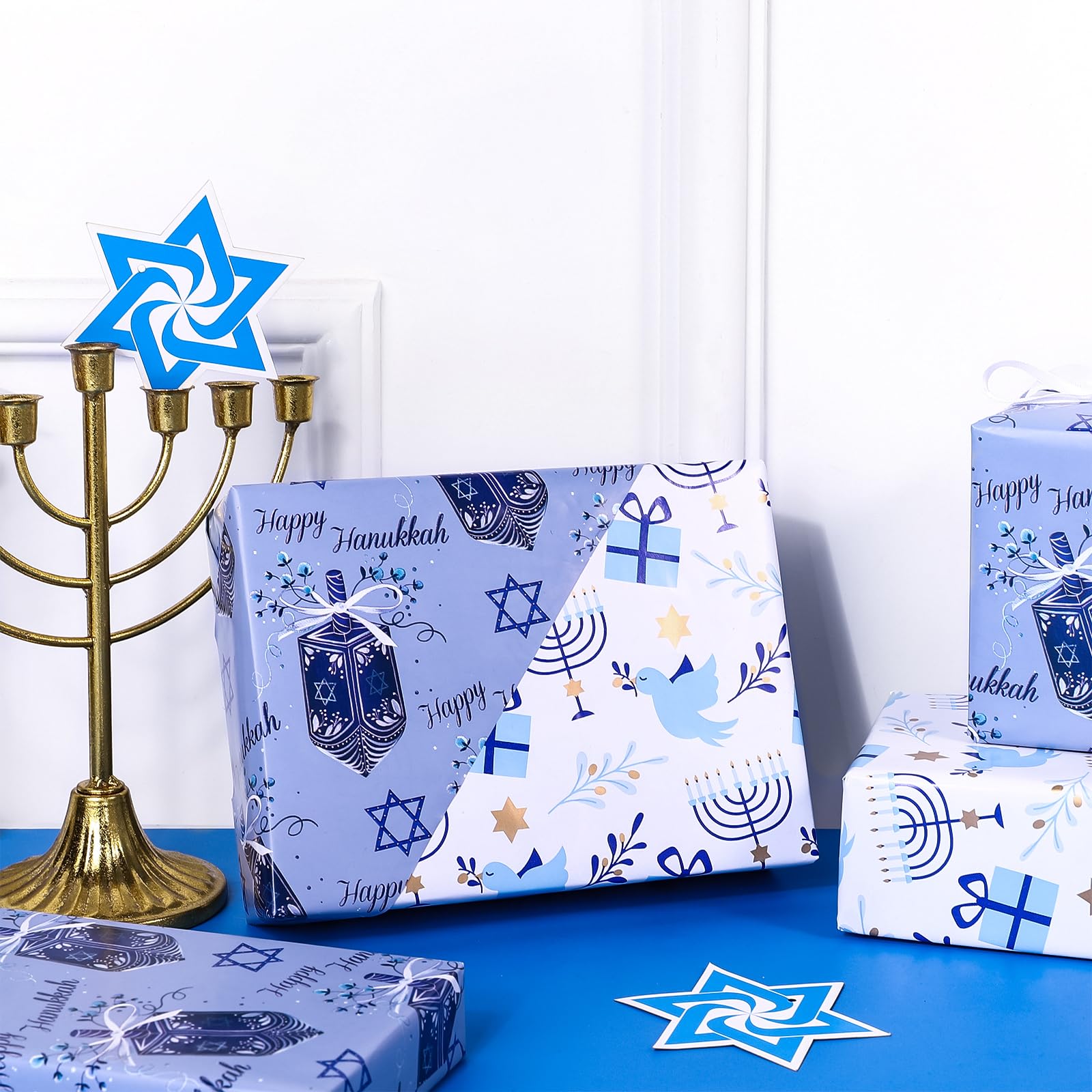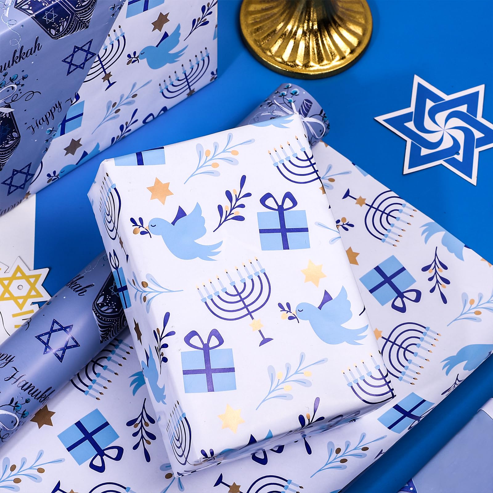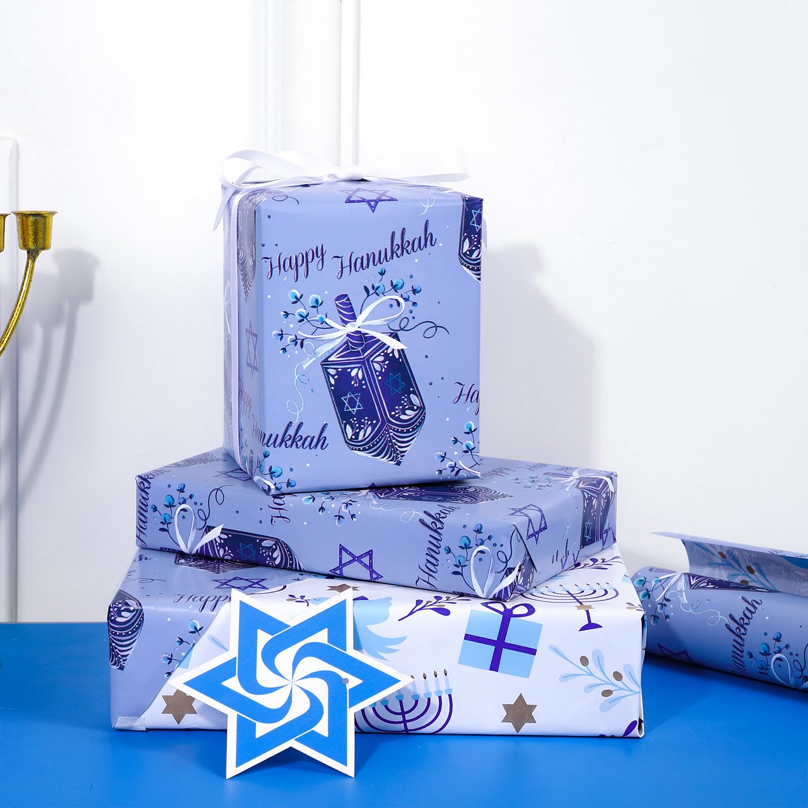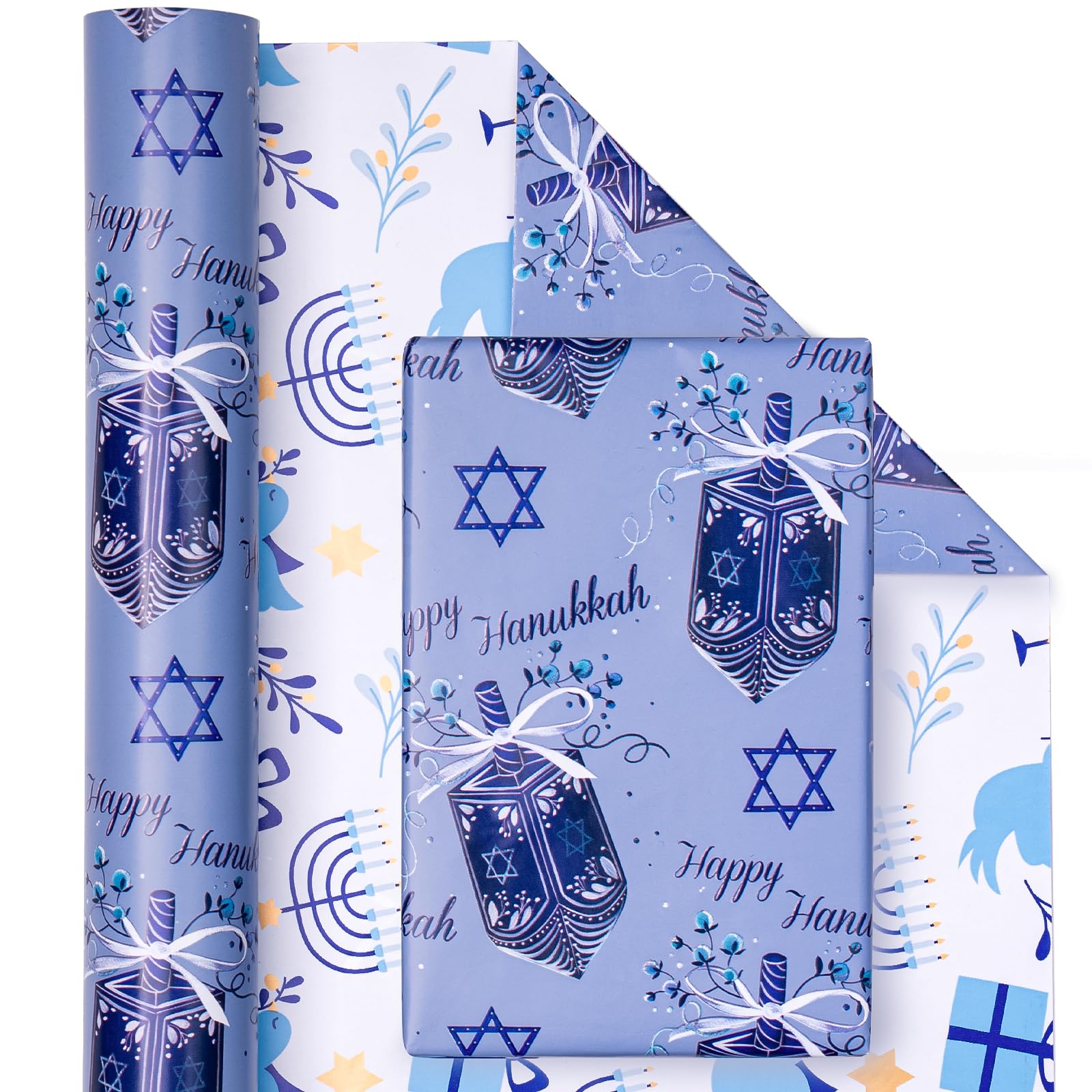 Perfect Size: Each roll measures 17 inches wide x 33 feet long, which provides you with a total of 46.5 square feet of paper. It's perfect for any small or medium - sized gift and is also very convenient to store. Reversible Design: Blue dreidels with "Happy Hanukkah" printed on one side, menorah lights and dove printed on the reverse. Two different designs make unique and varied gift presentations easy. Premium Quality: Created with high-quality paper materials, thick and not easily tear or rip. Item came with shrink film to prevent wrapping paper from scratches and reduce dust. Use All Winter: Whether it's the joyous celebration of Christmas or the holiday season filled with family gatherings and gift - giving traditions, it is an outstanding choice. It is also great for decorating the Christmas tree. Wrap Your Love for Christmas: You can wrap your love with our special Christmas wrapping paper, adding a splash of color to all of your gifts. Your family, children, and friends will feel your sincere Christmas wishes this holiday season. Quality Customer Service: Any question about products or orders, please feel free to contact the customer service, we will try our best to solve the problem.