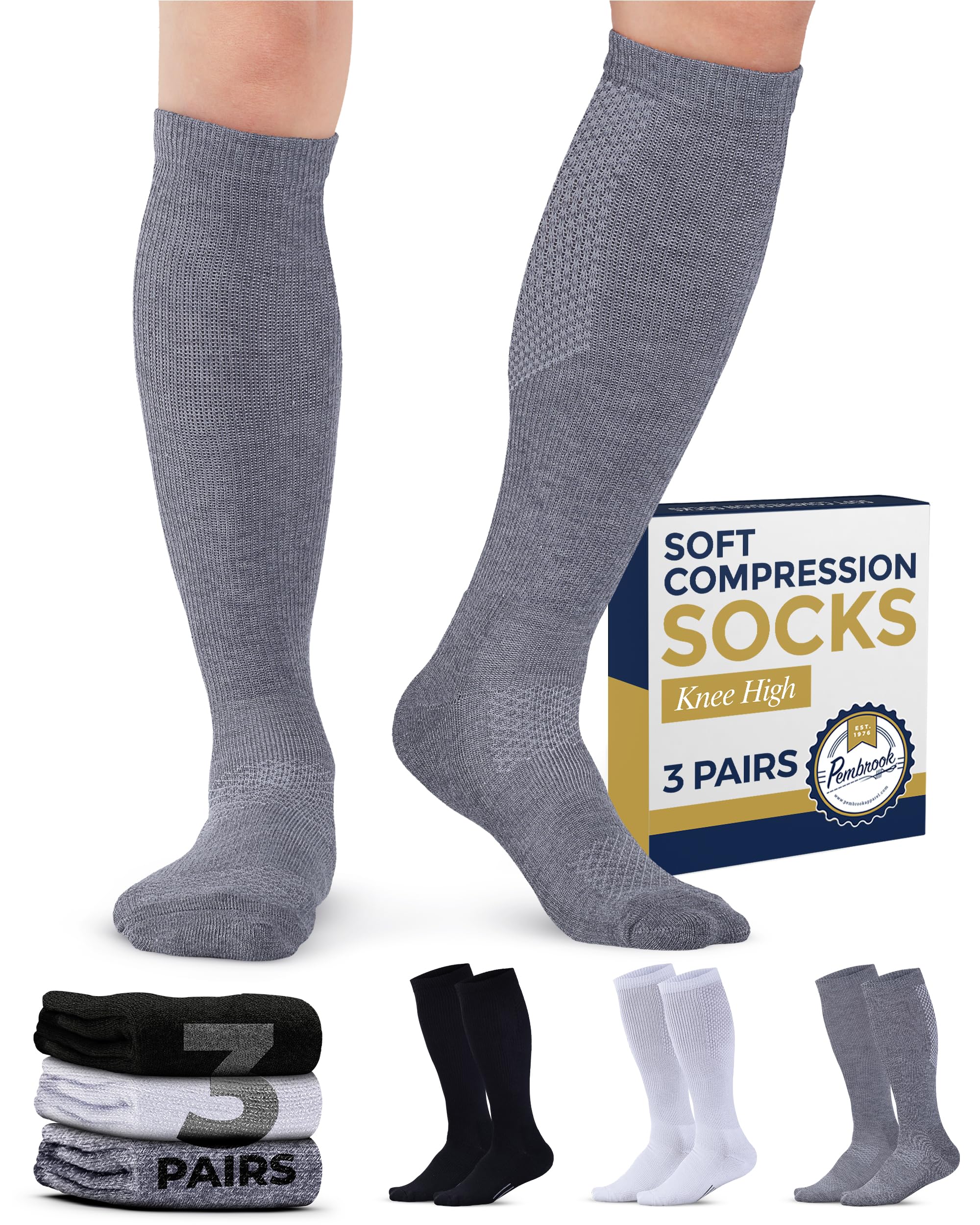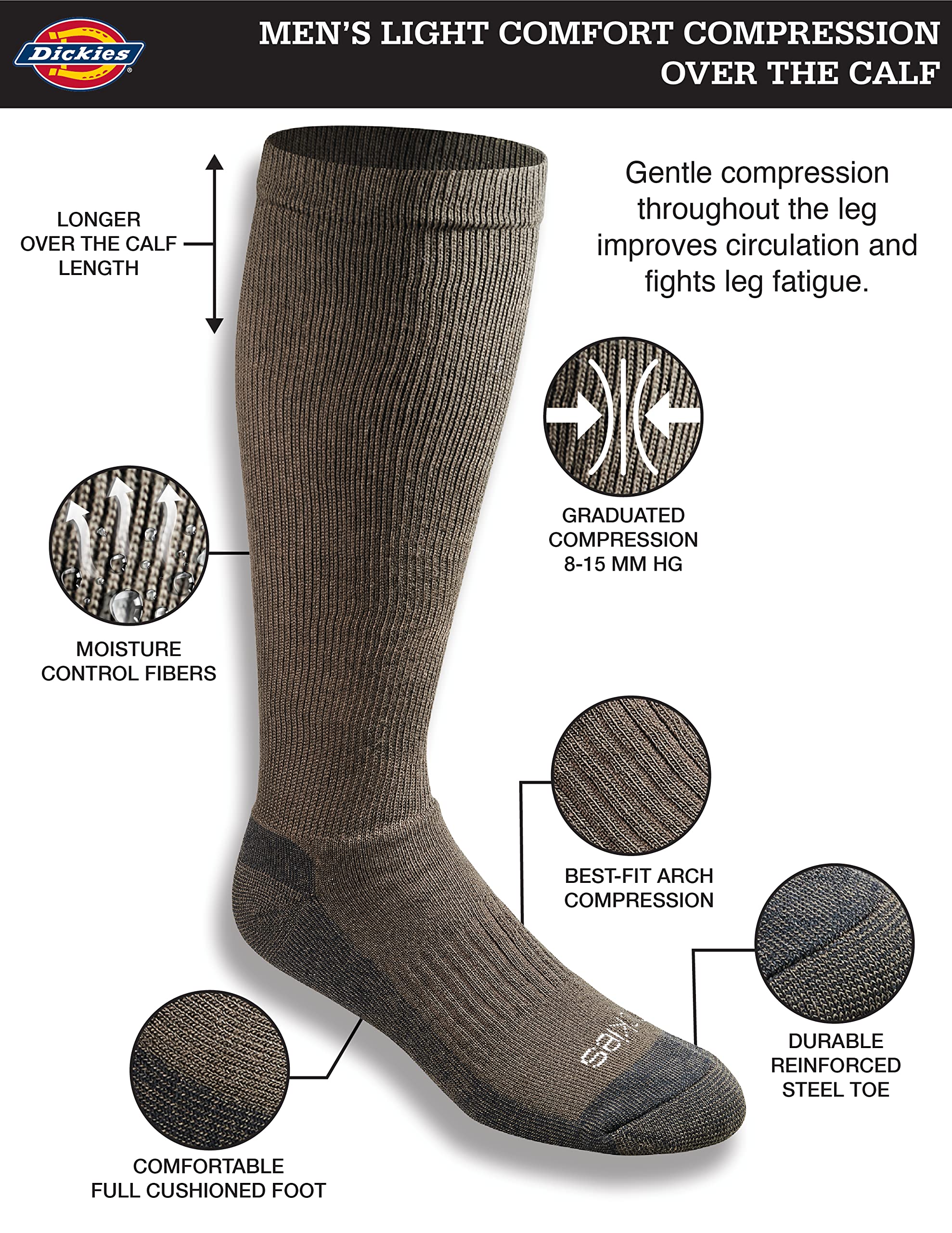 Description Dickies light weight comfort compression socks for men circulation is engineered with gentle mild compression throughout the leg to improve circulation and fight leg fatigue. Compression socks are not too tight or hard to get it on and fit well, these socks are mild compression grade between 8~15mmHg. Over the calf compression socks constructed with moisture control fibers, compression sock help improve performance, fast recovery, increase blood circulation and reduce fatigue. Perfect for long flight travel, long hour shifts, teachers, and seniors. For Over 95 Years Dickies has been making hard-duty work products built to stand up to whatever life throws at you. Dickies Work Socks are built with purpose to deliver superior comfort and performance on and off the job.