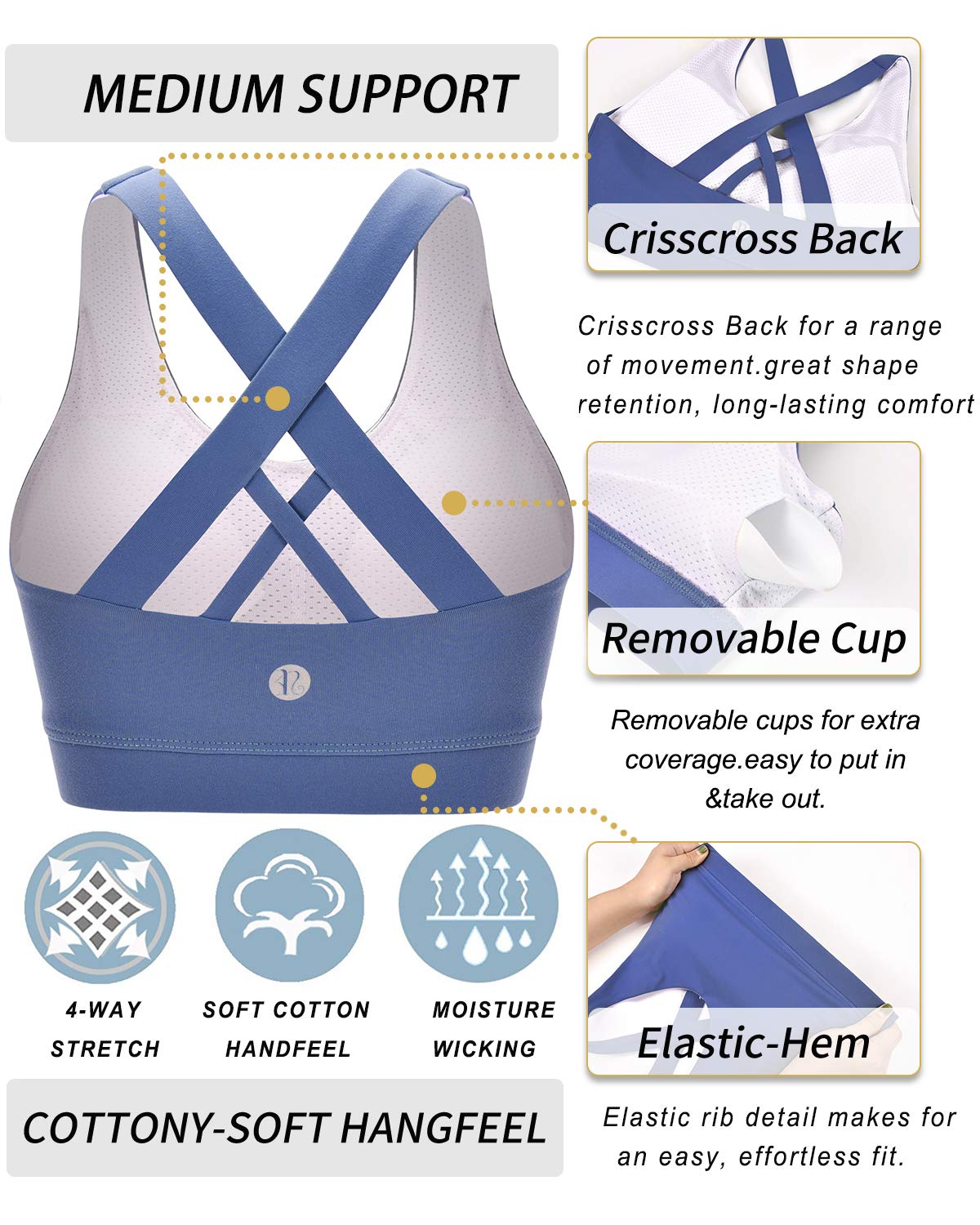 WHAT CAN WE OFFER YOU : Moisture-wicking Technology Metial Which Mean that You Can Enjoy Keeping Your Body Cool & Dry. Super Soft Elastic Band for Comfort & Movement Which Will Allow You Can Enjoy Sinking into Your Practice without Sacrificing Comfort. Built for Mid-Impact Support so You Will Get Staying Fit & Focused .We Wear-tested by Our In-house Team for the Perfect Fit , Goodbye Old Bra !!