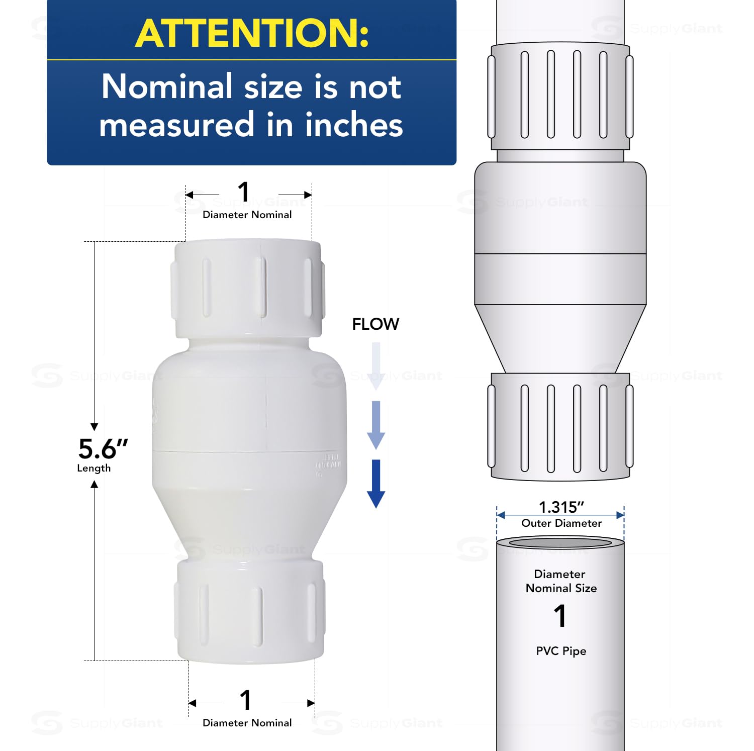 The Midline Valve PVC Inline Check Valve is a reliable solution for backflow prevention in your cold water pipes. Its stainless steel, spring-loaded check mechanism ensures leak-free solvent connections, while its ISO 9002 approved manufacturing guarantees quality. This valve is ideal for flow control in landscaping sprinklers, pools, water parks, and aquariums, and can be installed vertically or horizontally. It has a cracking pressure of .5 PSI and can withstand up to 150 PSI at 73°, with a temperature range of 41°- 140°. The valve is made of PVC, providing improved performance, increased safety, and better rust and corrosion resistance compared to steel piping systems. It measures 1.5 x 2 x 2 inches and is available in white, with 1 inch NPT threads. This product is part of the PVC-check-valves-for-backflow-prevention category and is manufactured by Midline Valve.