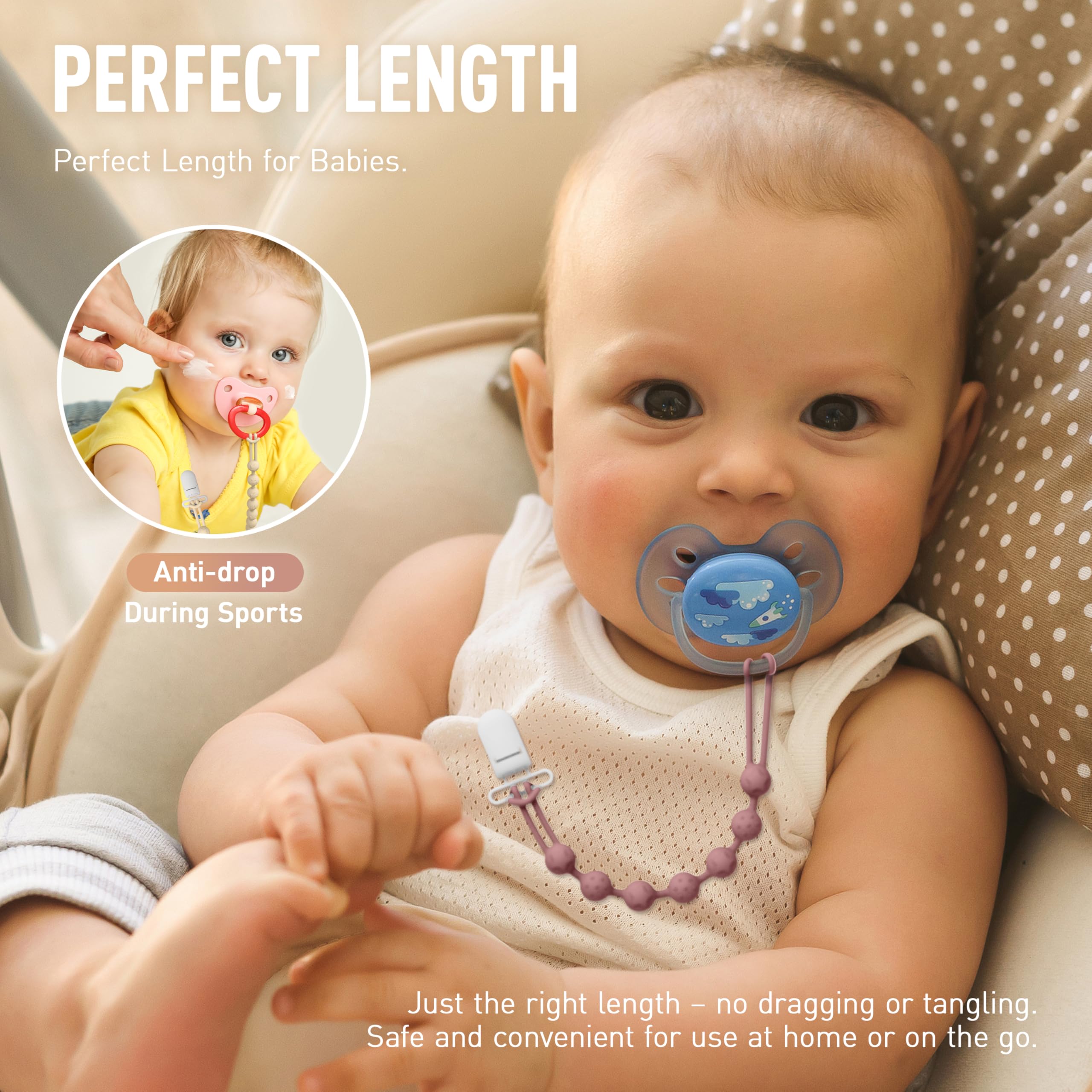 FOOD GRADE SILICONE: The beads of our pacifier clip are made from 100% pure food-grade silicone—a material we carefully pick for its dependable safety, letting you use the clip with total ease