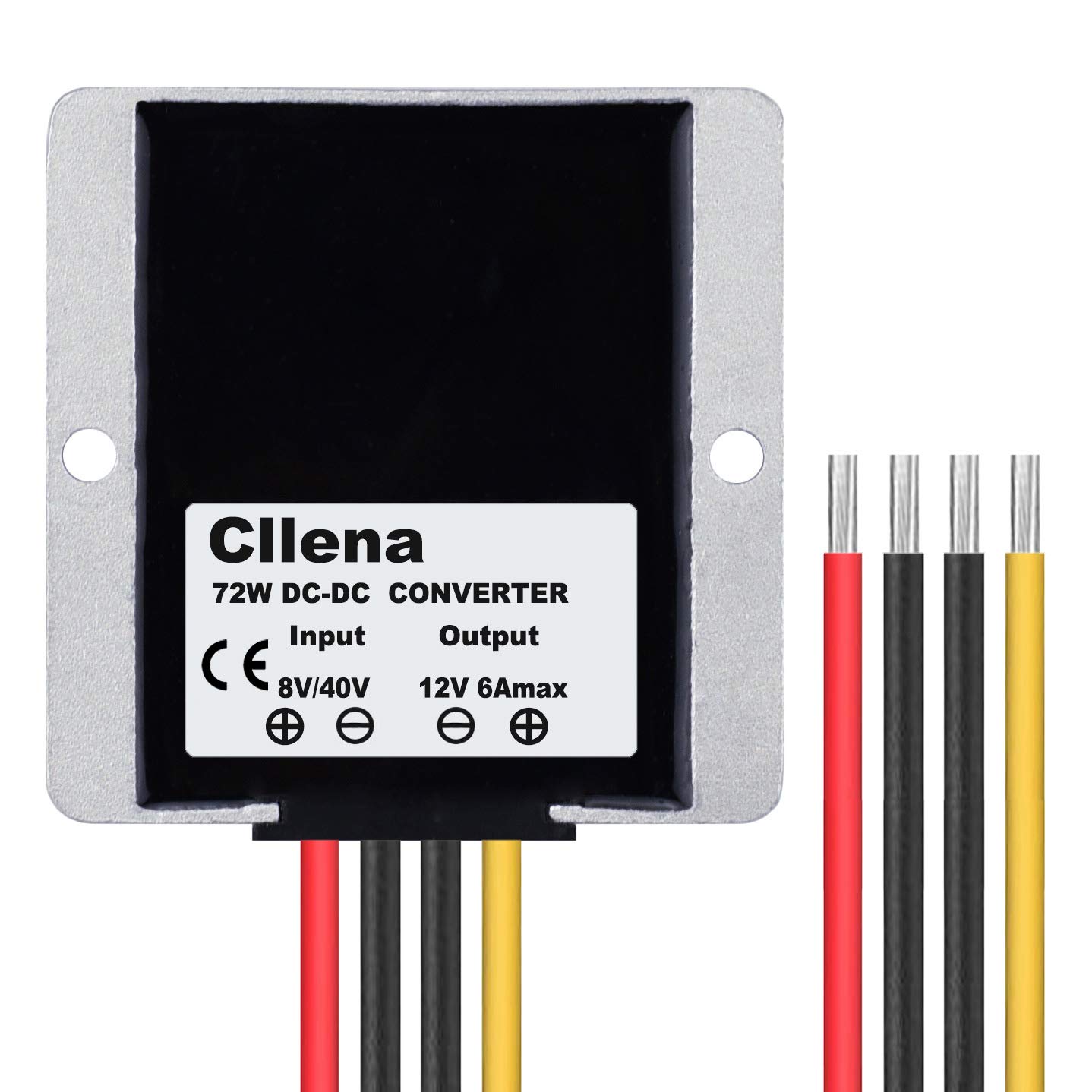 Wiring: OUTPUT+ to LOAD+, OUTPUT- to LOAD-; INPUT+ to BAT+, INPUT- to BAT- Note: * Never connect to solar panel, PWM/MPPT charge controller, inverter or wind turbine. * Never use for charge. Keep good air convection. * Never reverse the polarity. * Use the enough big cable to avoid the voltage drop. Specifications: Input Voltage Range: 8V-40V DC Output Voltage: DC12V 6A Output Rated Power: 72W Efficiency: 97% (half load); 95% (full load) Ripple: 200mVp Line Regulation: ±0.2% Load Regulation: ±0.2% Voltage Accuracy: ±1.5% Enclosures: IP68 Case Operating Temperature: -40~85°C Weight: 232g Features: 1. 100% full power and stable current output, non-isolated module. 2. Industry grade DC 8V-40V to DC 12V step down/up converter, efficiency up to 95%. 3. Die-cast aluminum shell, epoxy potting, cooling by free air convection; Waterproof level IP68 and anti-shock protection. 4. Protections: Over-current, Over-voltage, Over-temperature, Over-load and Short-circuit, auto-recovery when device is back to normal operating. 5. Certificates: CE/RoHS, 1 year warranty, lifetime up to 100,000 hours. Package included: 1 x DC 8V/40V to12V 6A Converter Questions: How to choose the correct current for loads? For example, if the max current of your load device is 10A, then choose 10A/0.8=12.5A at least for resistive loads according to international standard. If the load device is motor or compressor, then you may choose 10A/0.5=20A according to real testing result since the motor and compressor starting current may be 2-3 times than nominal current.