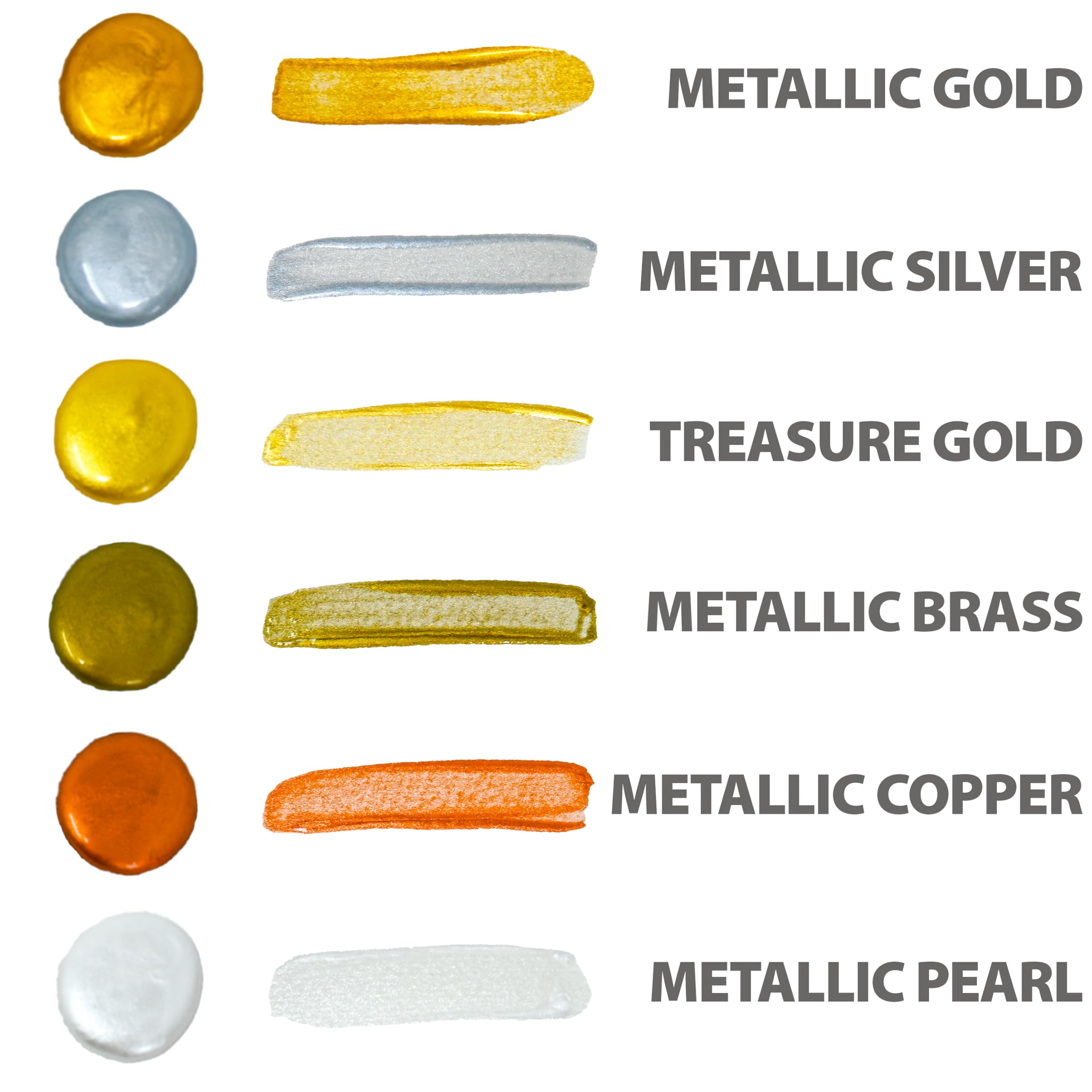 These shimmering colors will add luster to any project. Mix with regular colors to create metallic shades. Six color set includes brass, copper, gold, pearl, silver and treasure gold. 8 oz. flip-top bottles. AP Seal, non-toxic.