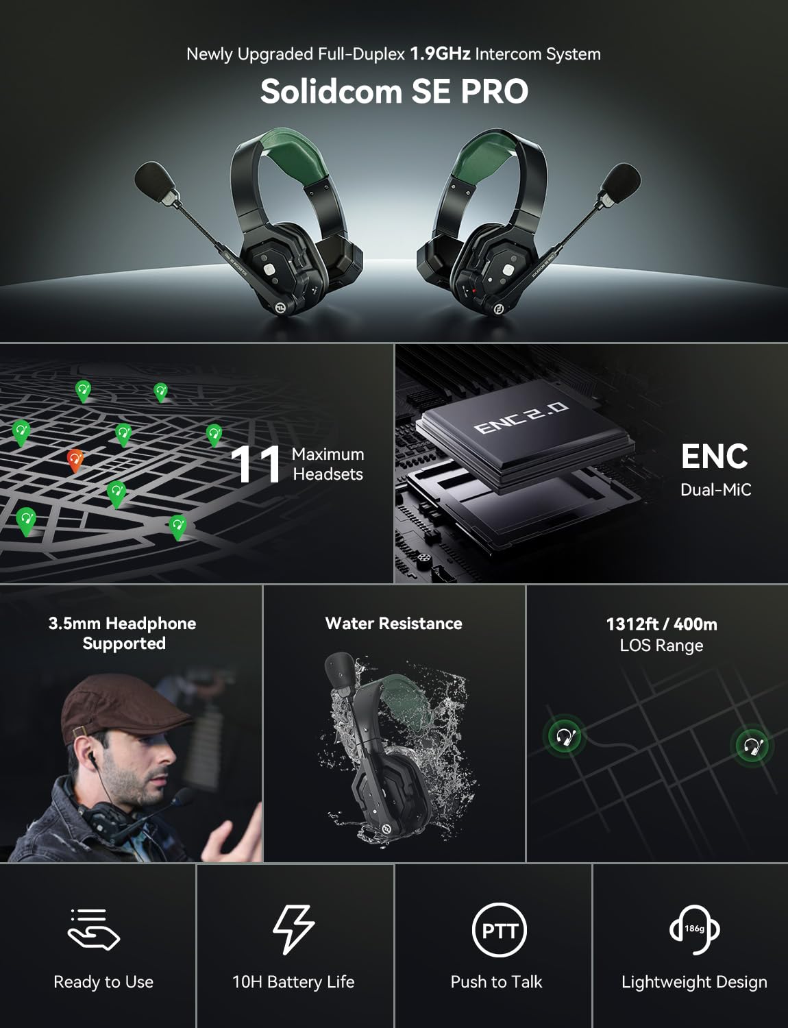 【ENC Noise Cancellation & Dust and Water Resistance】The Solidcom SE PRO features dual-mic noise cancellation to effectively minimize ambient sounds. Its 150Hz–7kHz wideband frequency response delivers rich, immersive audio quality. Built with dust and water resistance, it withstands rain and splashes, ensuring reliable performance and consistent connectivity in various environments.