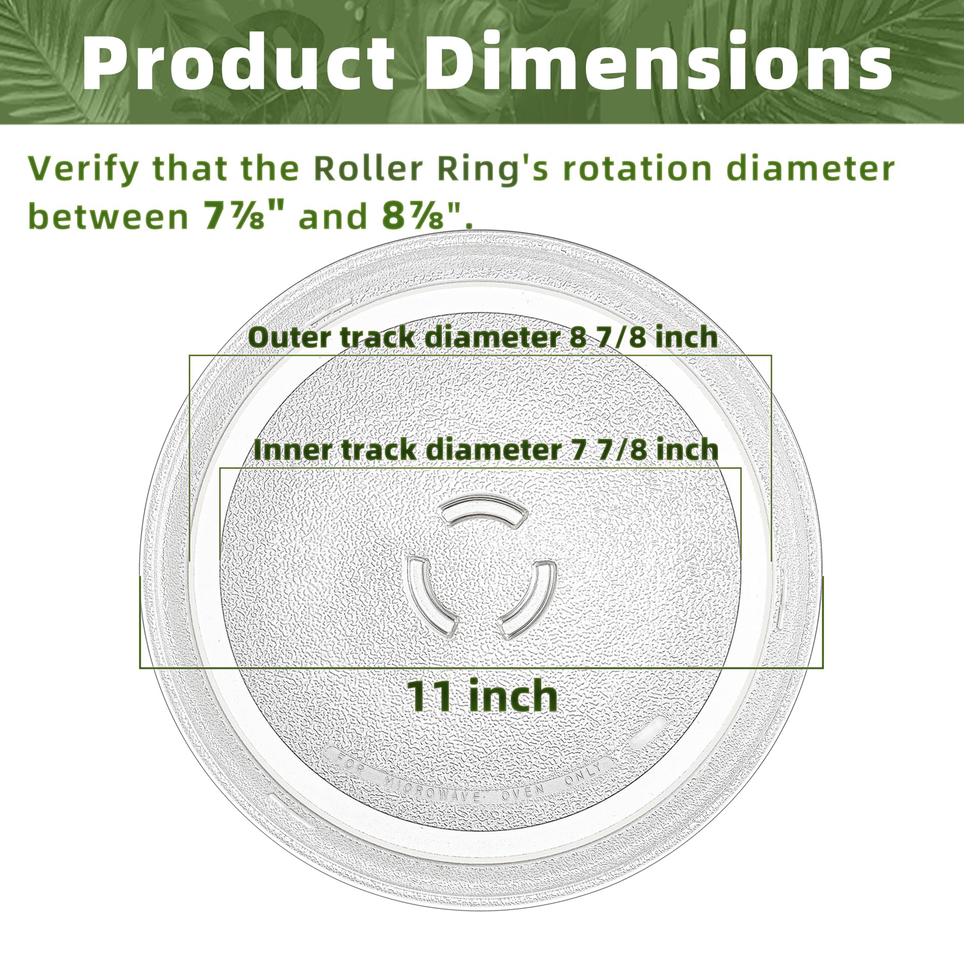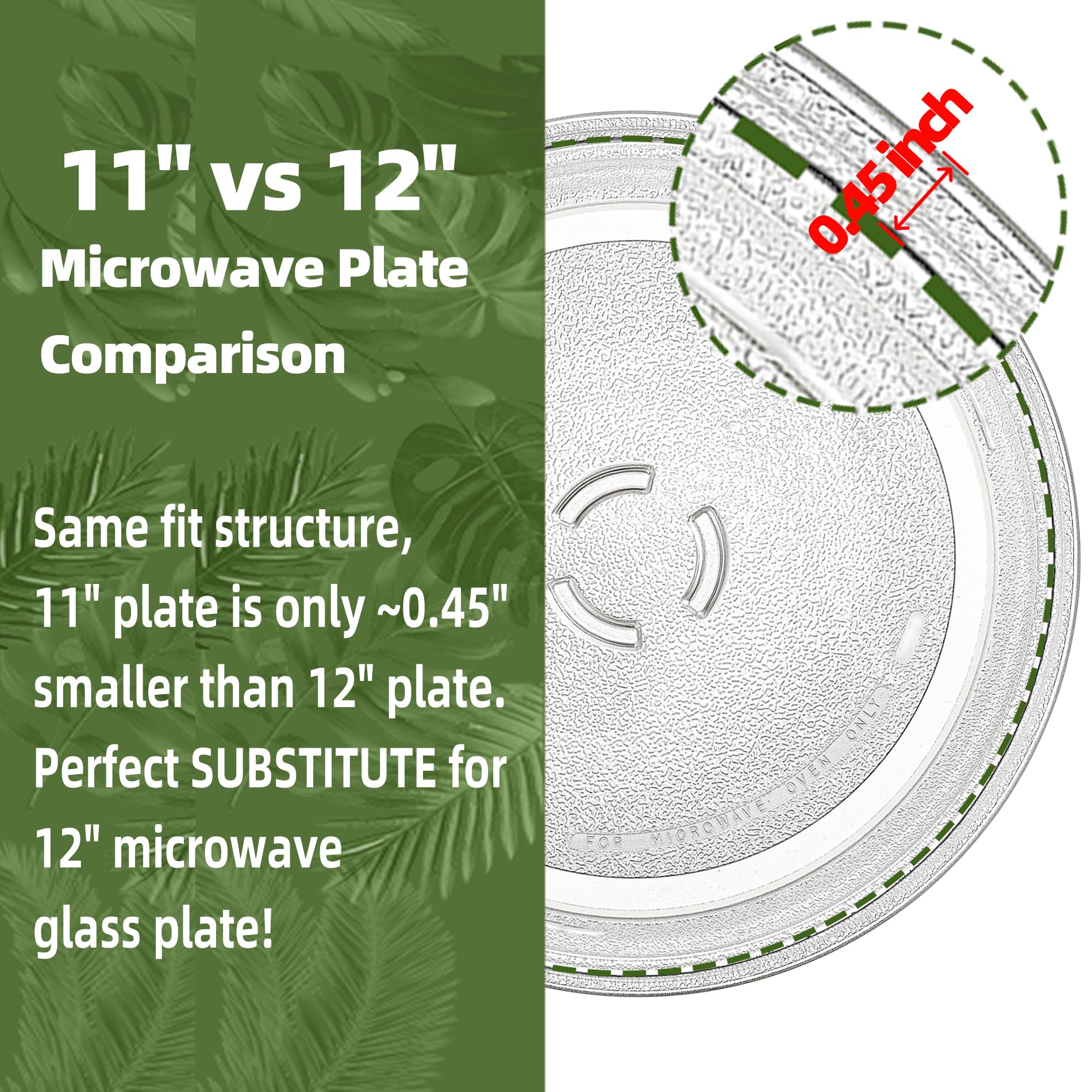 【Broad Compatibility】 It's NOT universal fit. The 11 in microwave turntable is compatible with Brands: Whirlpool microwave glass plate 4393799, W10435116, W11252182 etc (by 1 inch smaller than the original plate)