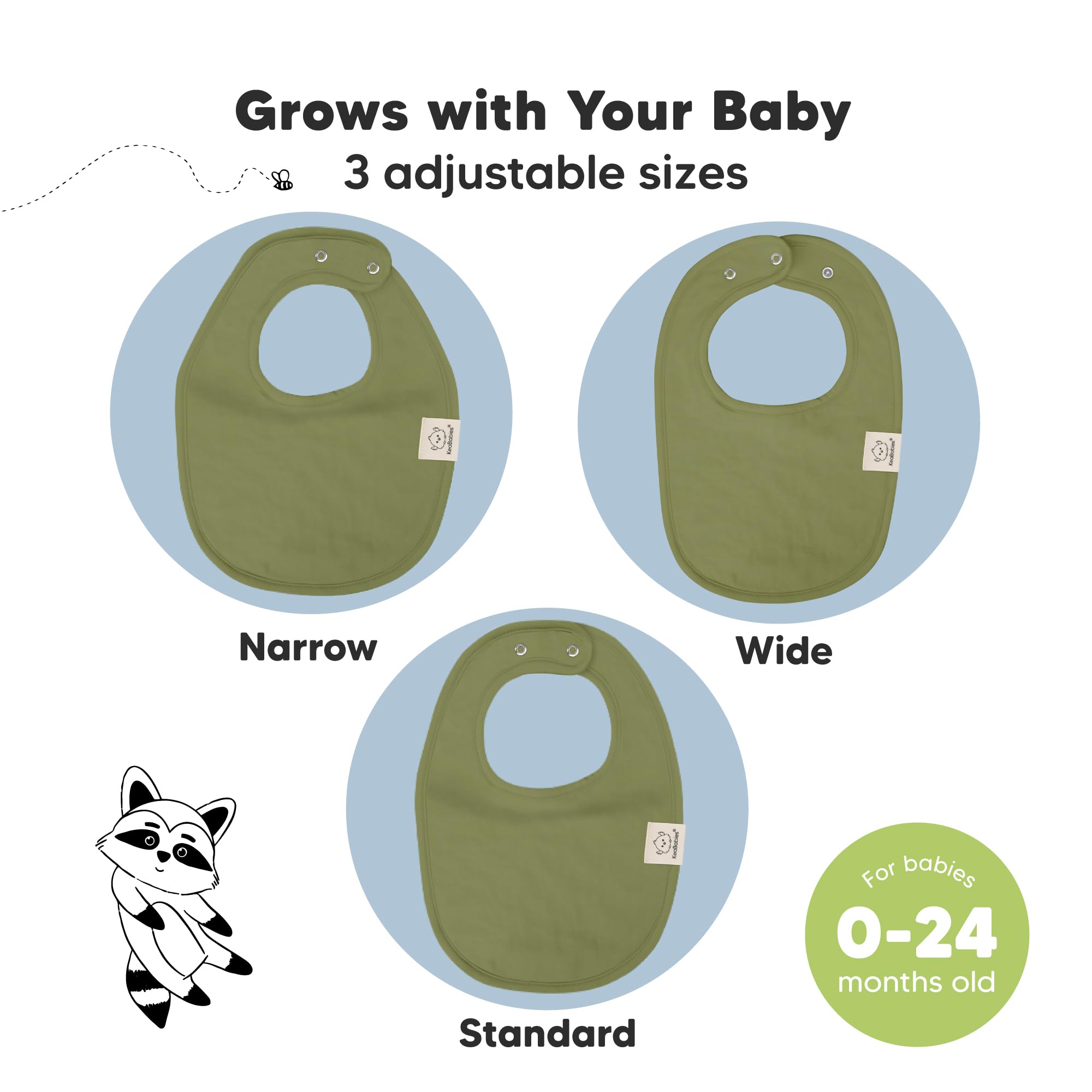 3 Adjustable Size With Soft Seams - With 2 sets of easily fasten nickel free snaps, you can adjust the girl and boy bibs according to your babyβs neckline. The soft wrapped organic cotton seams provide extra comfort for your baby and they wonβt feel a thing while having the baby cotton bibs on. Suitable for newborn babies up to 24 months.