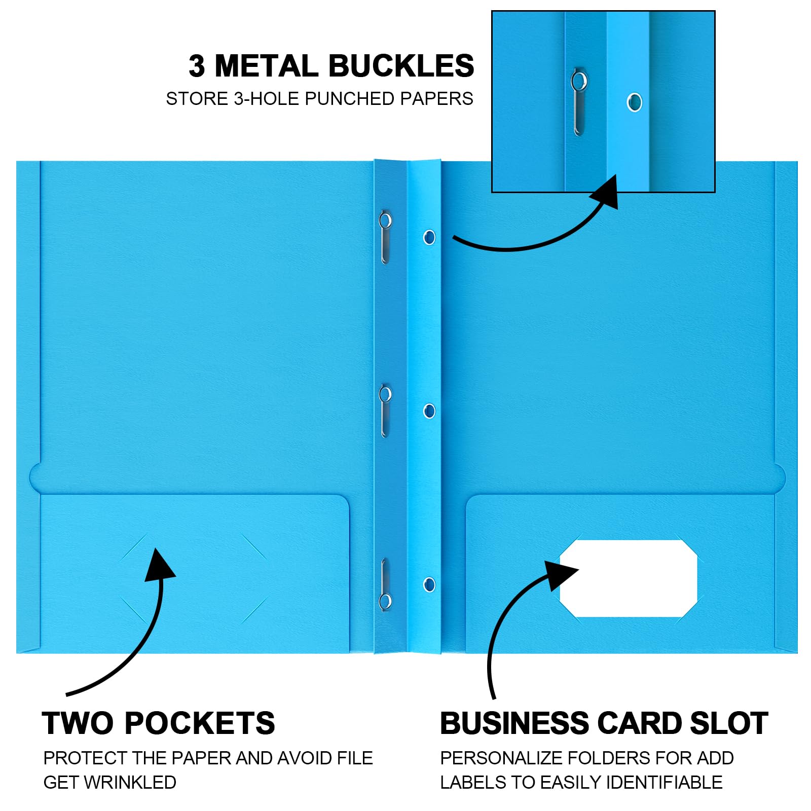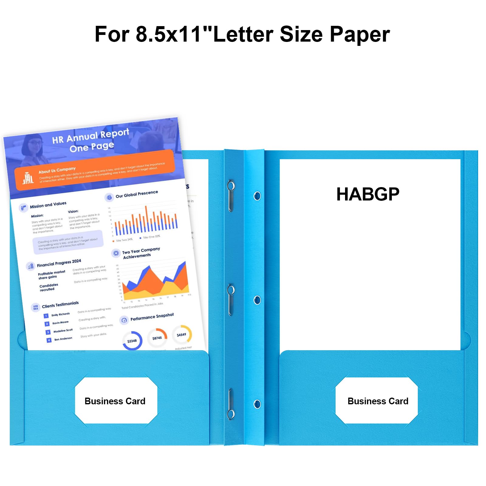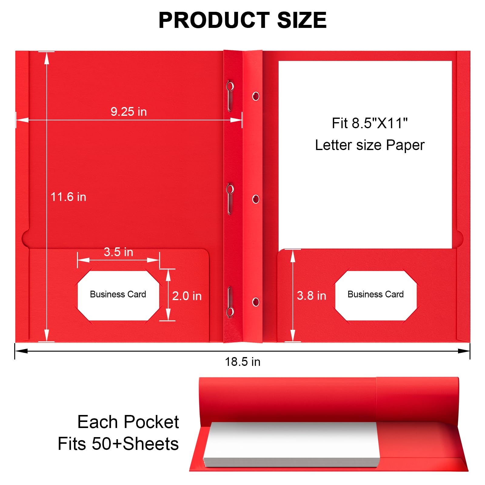 High Quality: Premium paper folders with pockets and prongs ideal for offices, schools, or large projects. Designed for 8.5” x 11” paper files. Each File Folders has two pockets and two business card slots design that provide ample storage space to hold 50 letter size sheets without folding or creasing them.