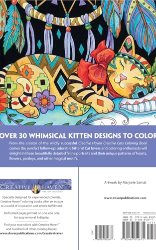 These cute kittens will pull at your heartstrings! Thirty-one fanciful designs to make you feel all warm and fuzzy while coloring. From the creator of the wildly successful Creative Haven Creative Cats Coloring Book comes the purrfect follow-up: adorable kittens! Cat lovers and coloring enthusiasts will delight in these beautifully detailed feline portraits and their unique patterns of hearts, flowers, paisleys, and other magical motifs. Pages are perforated and printed on one side only for easy removal and display. Specially designed for experienced colorists, Creative Kittens and other Creative Havenยฎ adult coloring books offer an escape to a world of inspiration and artistic fulfillment. Each title is also an effective and fun-filled way to relax and reduce stress. Get ready to be entertained with 31 unique designs of sweet and sassy kittens! Marjorie Sarnat, creator of the wildly successful Creative Havenยฎ Creative Cats Coloring Book delivers a purrfect follow-up featuring cuddly kittens. From hearts and flowers to paisleys and other magical motifs, this coloring book is full of fanciful designs that feature a variety of beautifully detailed feline portraits. Get creative and explore different color palettes! Pages are printed on one side only for easy separation, allowing you to proudly display your finished art on the walls of your home or office. The perfect affordable gift for cat lovers of all ages!