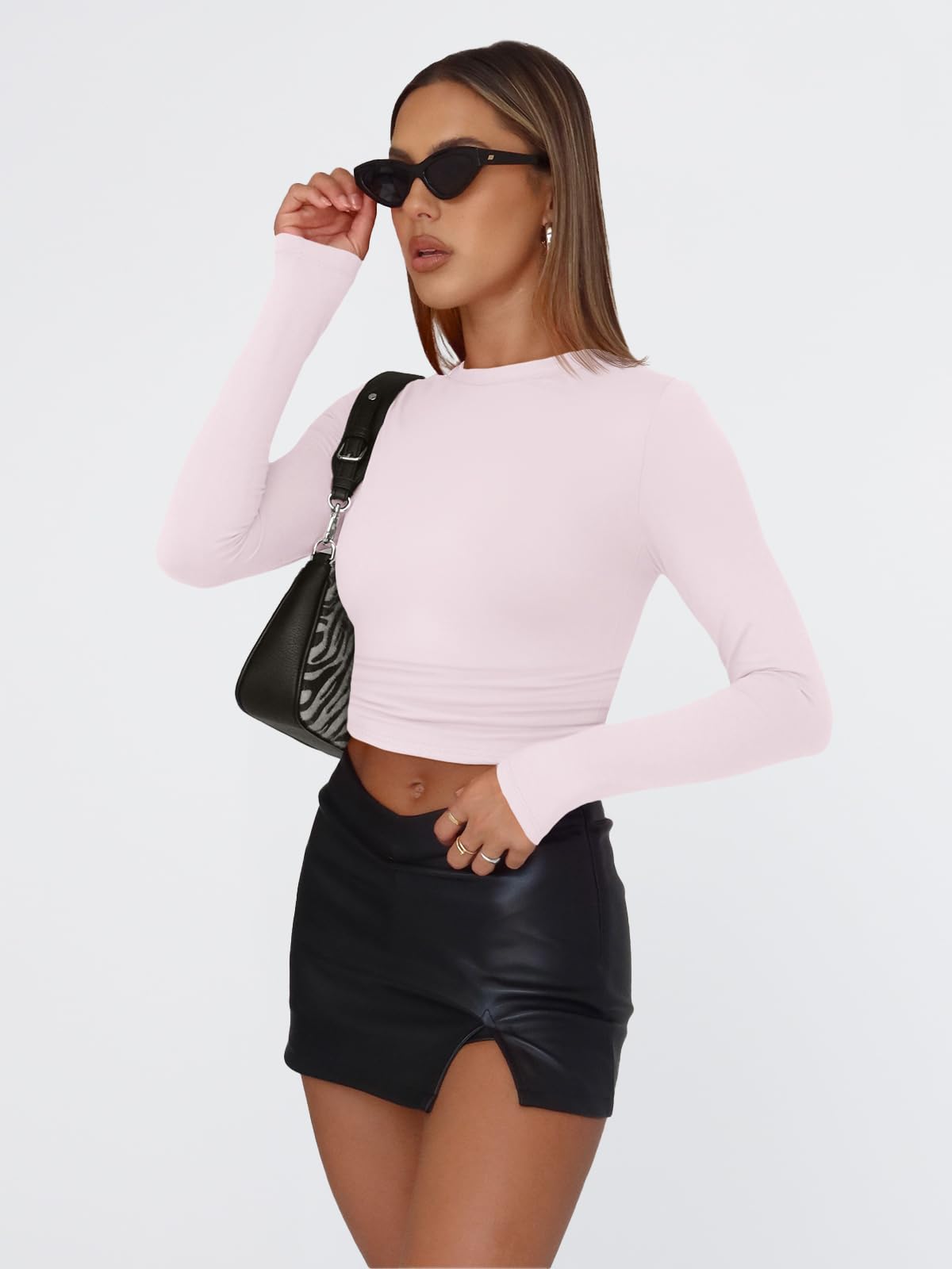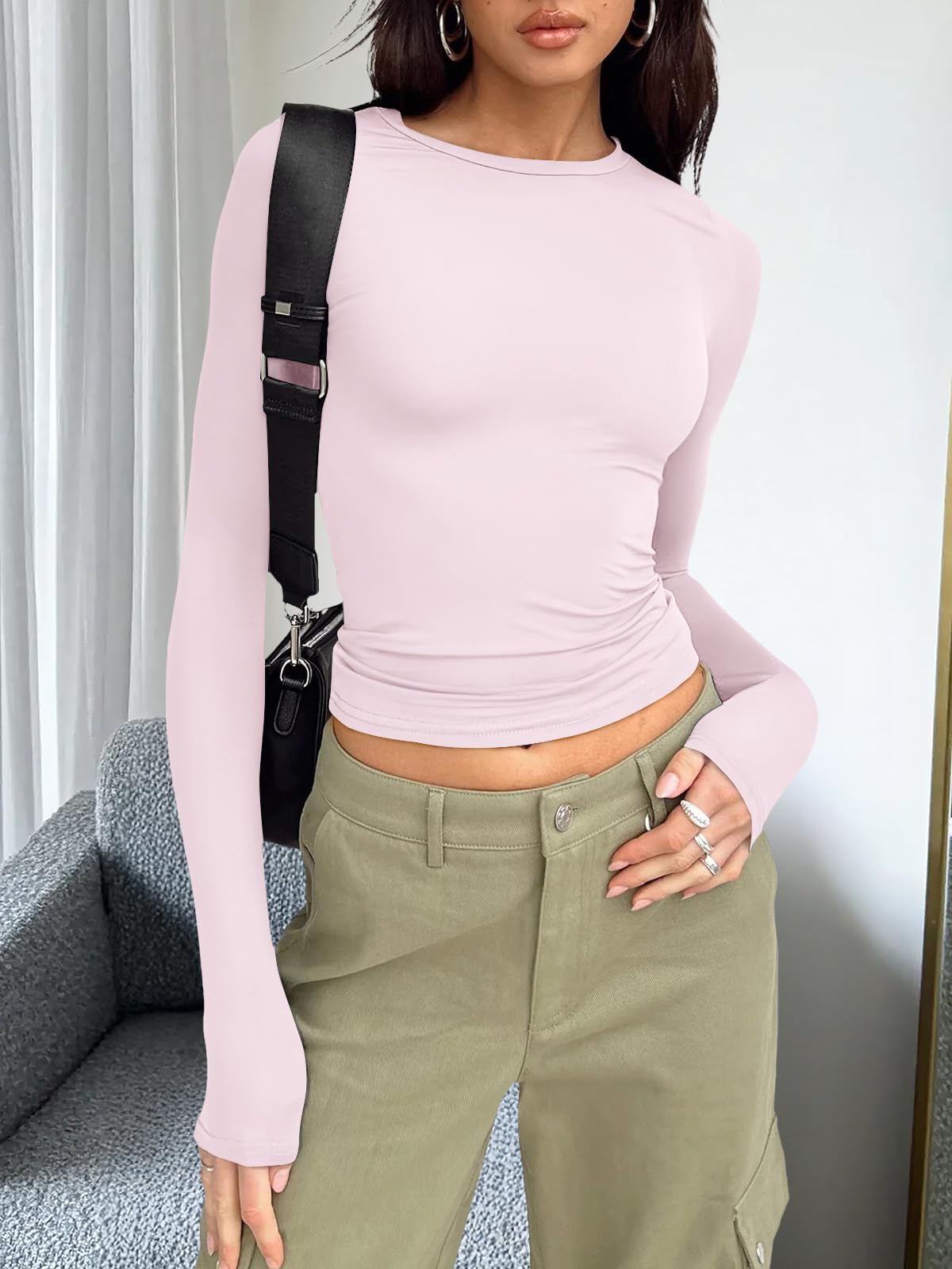 Design: Cropped and stretch fitted style,crew neck, tight underscrubs layer,you can wear it regularly or fold it up like a crop top,cute,slim fit,casual y2k style fashion