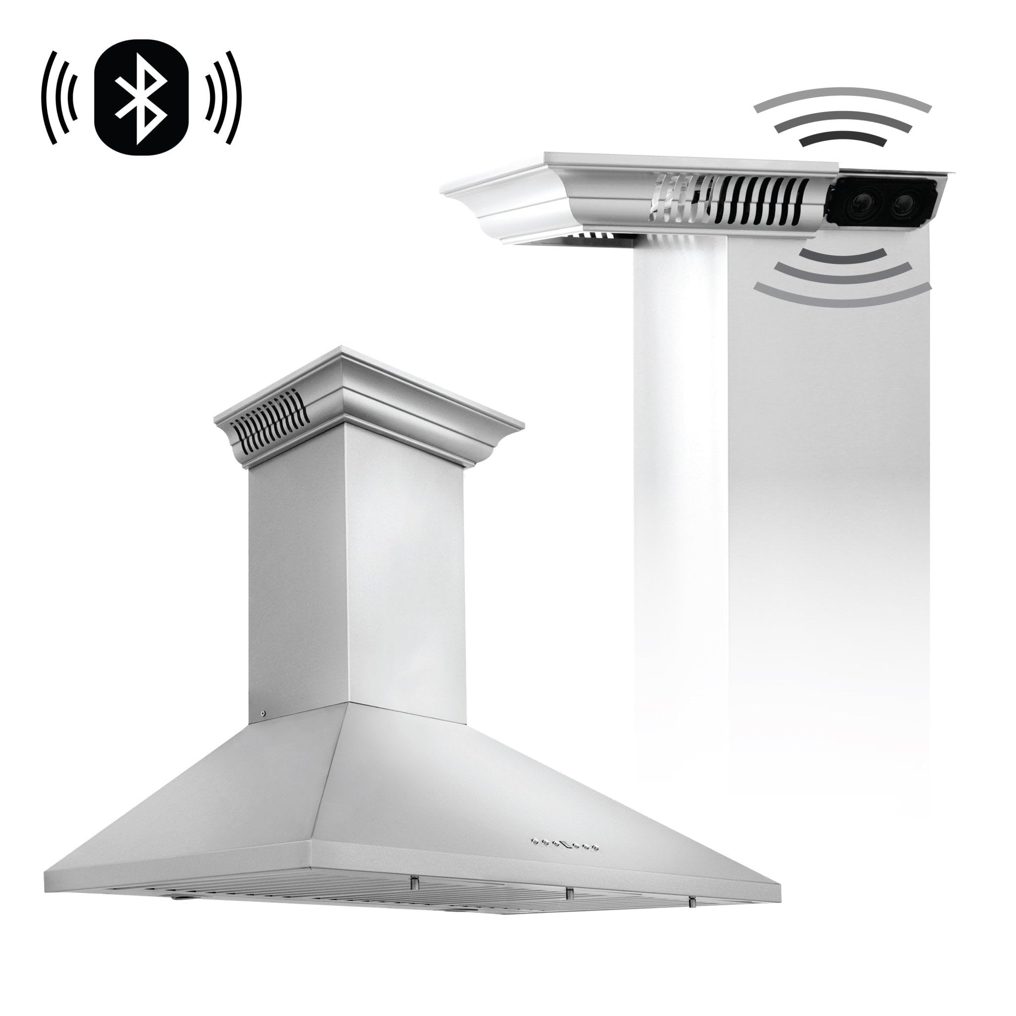 ZLINE 42 in. Wall Mounted Range Hood in Stainless Steel with Crown Molding. This wall mounted range hood is one of the best-selling of the 30 in. models. This beautifully hood with elegantly designed crown molding comes enhanced with a completely installed blower and fan, dishwasher-safe stainless steel baffle filters and a 4-speed push button control panel with an LCD display. Up to 760 CFM ventilation quietly, yet efficiently moves large volumes of air away from your cook-stove area. Short kits and extensions are available for shorter or taller ceilings (outside the standard 8 ft. to 9 ft. range). Contains everything you need for easy installation and factory-tested assurance of performance along with a 3-year parts gives you the confidence that you will enjoy this range hood for years to come. Includes a free LED light upgrade.