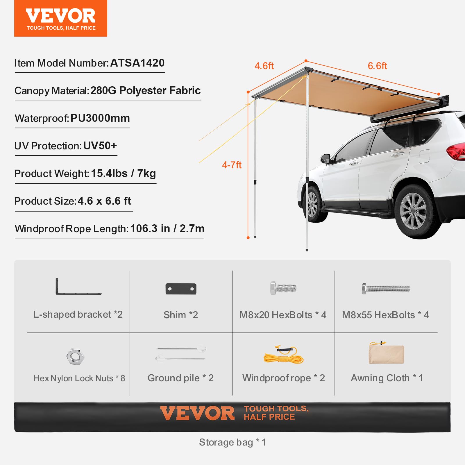 VEVOR Car Awning - Your Ultimate Outdoor Shelter 【Expansive Coverage】Experience 38 sq.ft of versatile shade with our VEVOR Car Awning, measuring 4.6x6.6 ft. This robust awning provides complete protection from sun, rain, and snow, comfortably fitting 3-5 people. Perfect for various outdoor activities, it ensures you stay shielded from UV rays and adverse weather with its waterproof and windproof design.