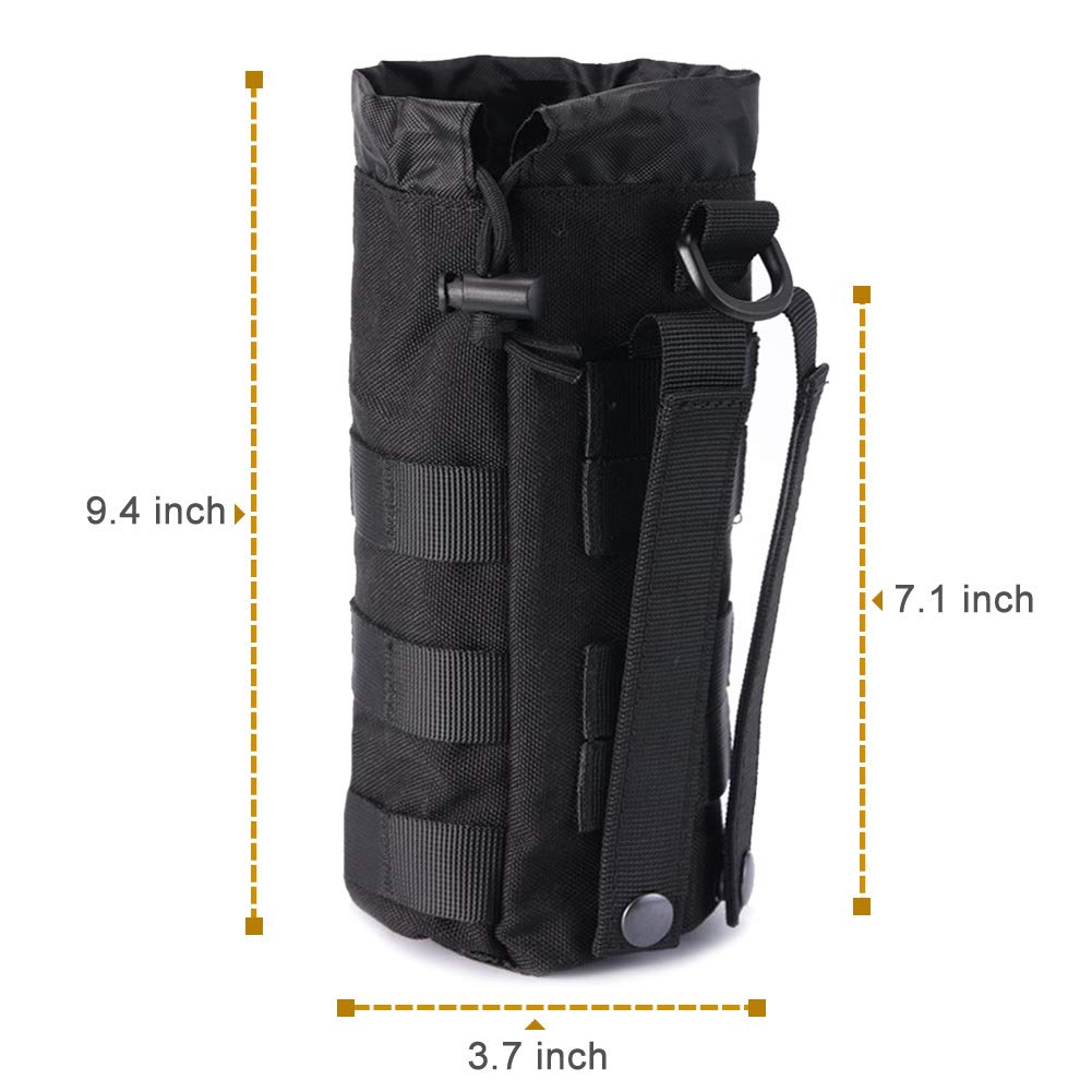 DIMENSIONS:This Tactical Pouch Bag Fits most Standard Size Water Bottles. Diameter:3.55inch; High:9.45inch. Size for Carrying 0.5 Liter Smartwater. Mesh Bottom Design to Prevent Water from Collecting at the Bottom of The Pouches.
