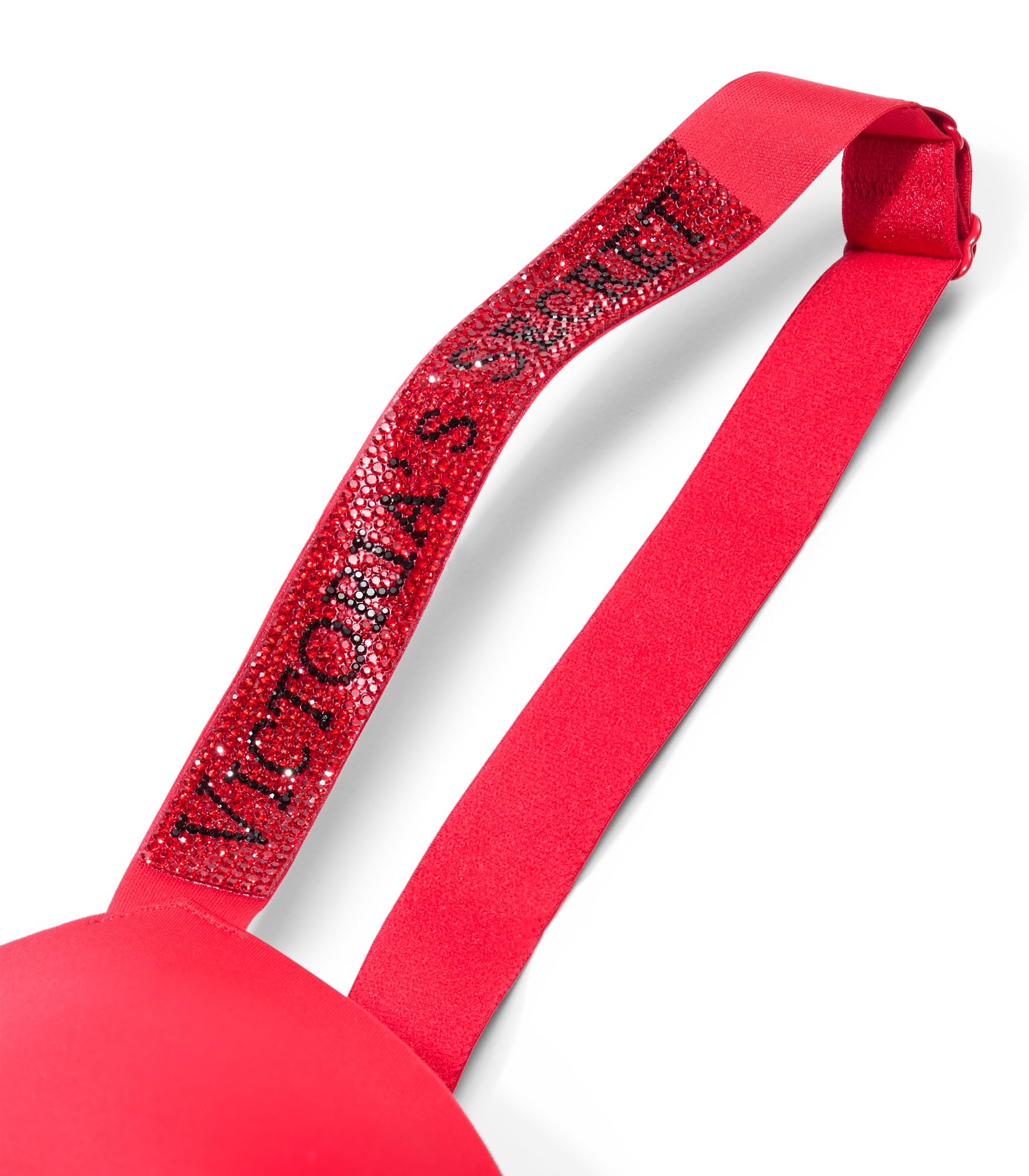 Featuring adjustable rhinestone logo straps and convenient back hook-and-eye closure.